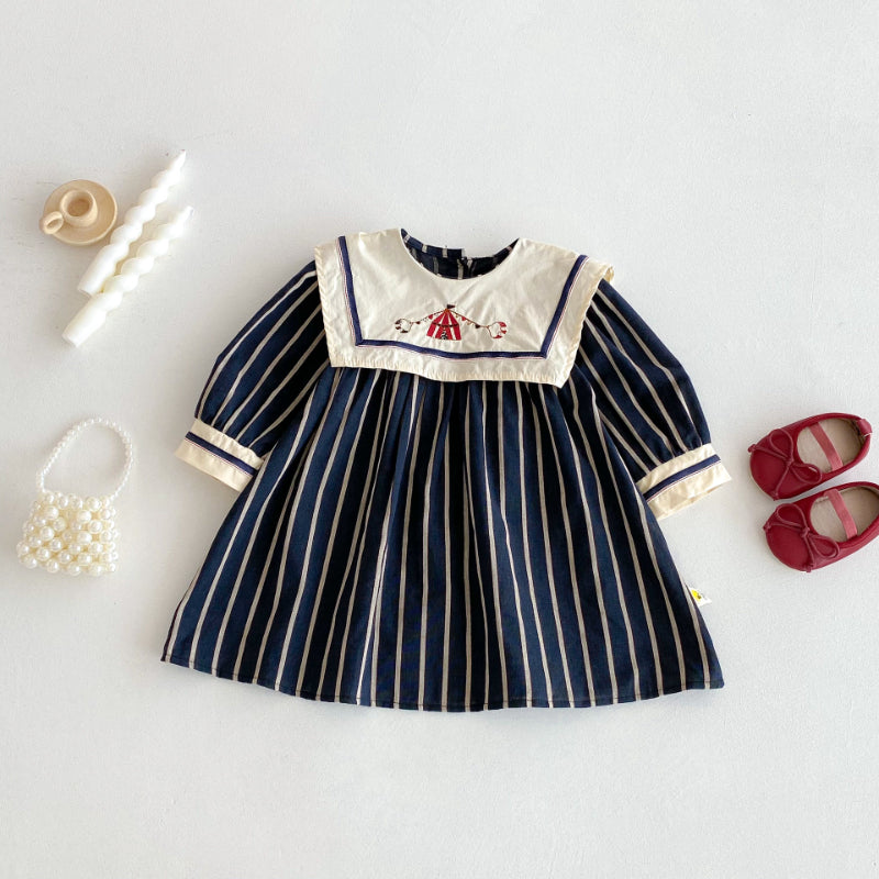 【73-130cm】レトロ 刺繍 ストライプ ワンピース¥2,520 JPY¥4,200 JPY