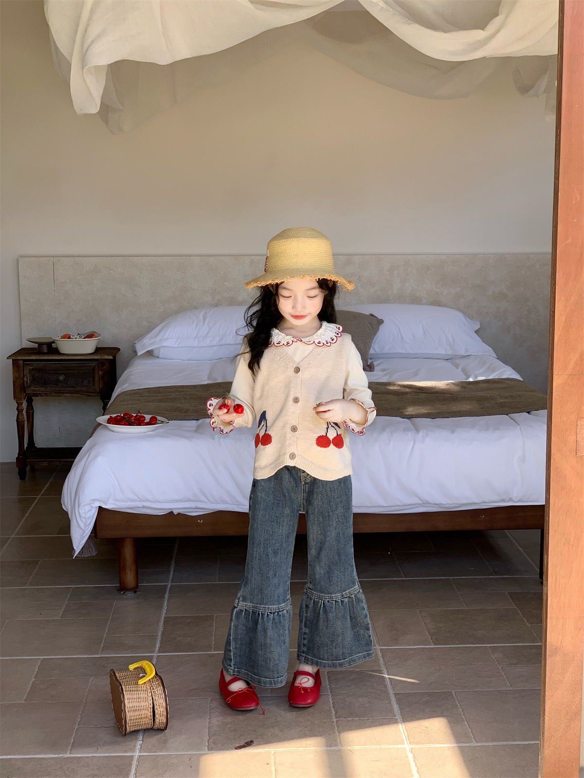 【90-140cm】チェリー柄 女の子 ベスト/トップス/デニムパンツ