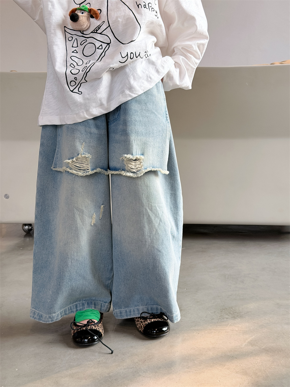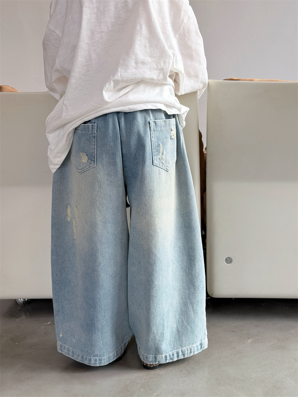 【90-150cm】デニムパンツ ダメージ加工 ゆったり カジュアル 韓国風 ロングパンツ