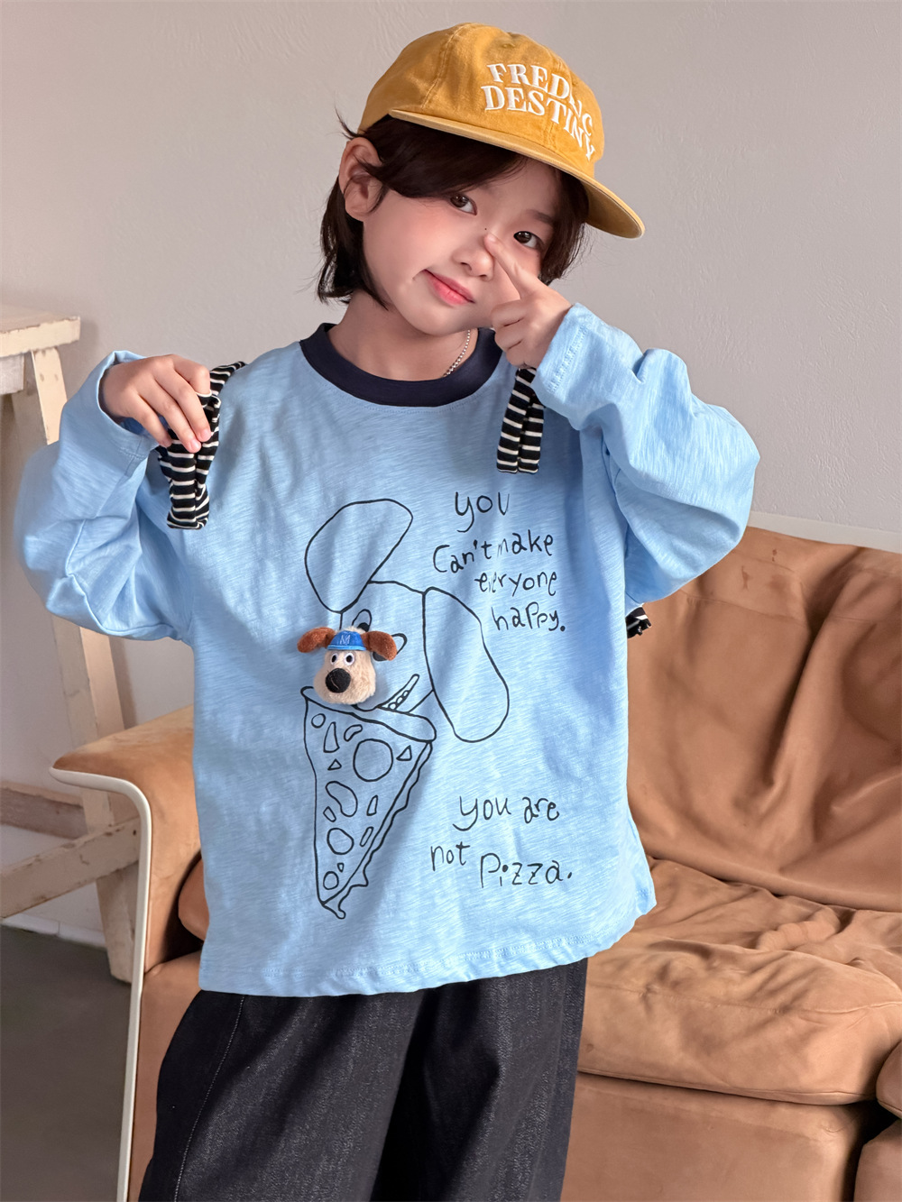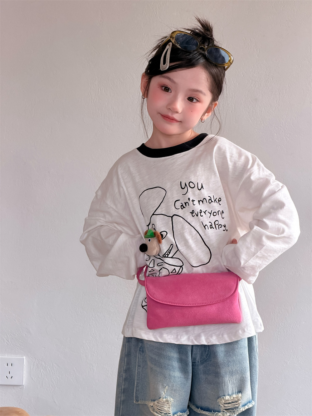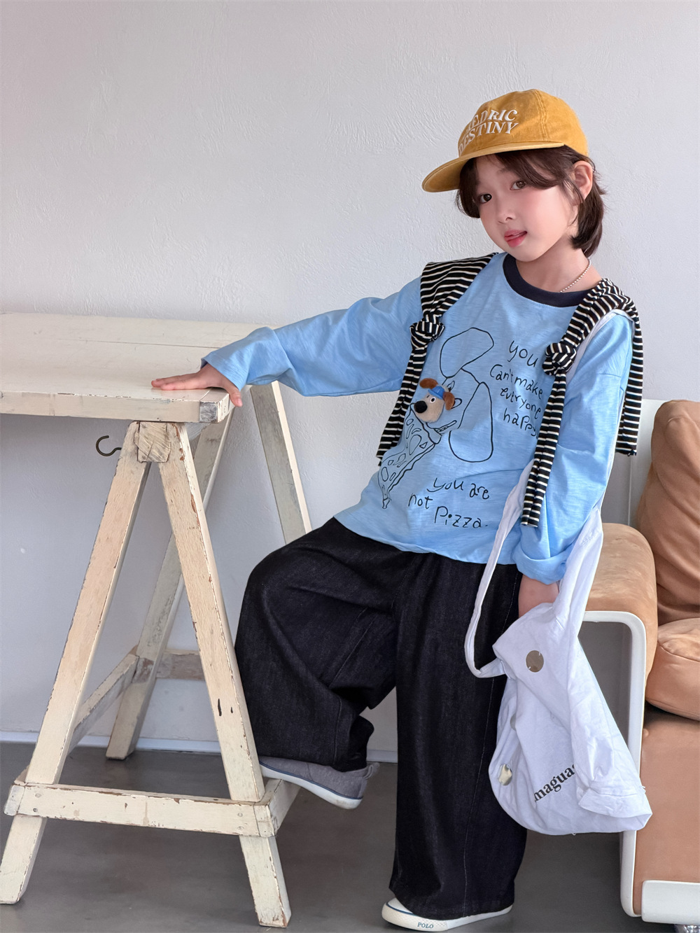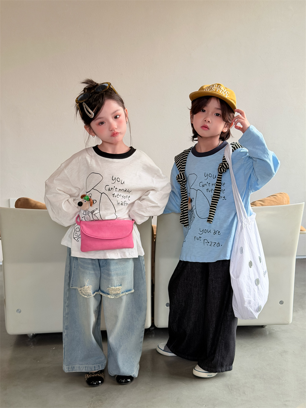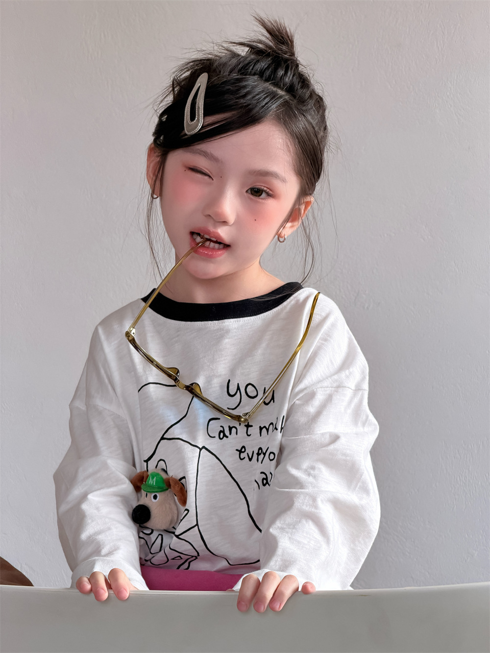 【90-150cm】長袖Tシャツ 男女兼用 犬柄プリント 配色襟 ゆったり カジュアル トップス