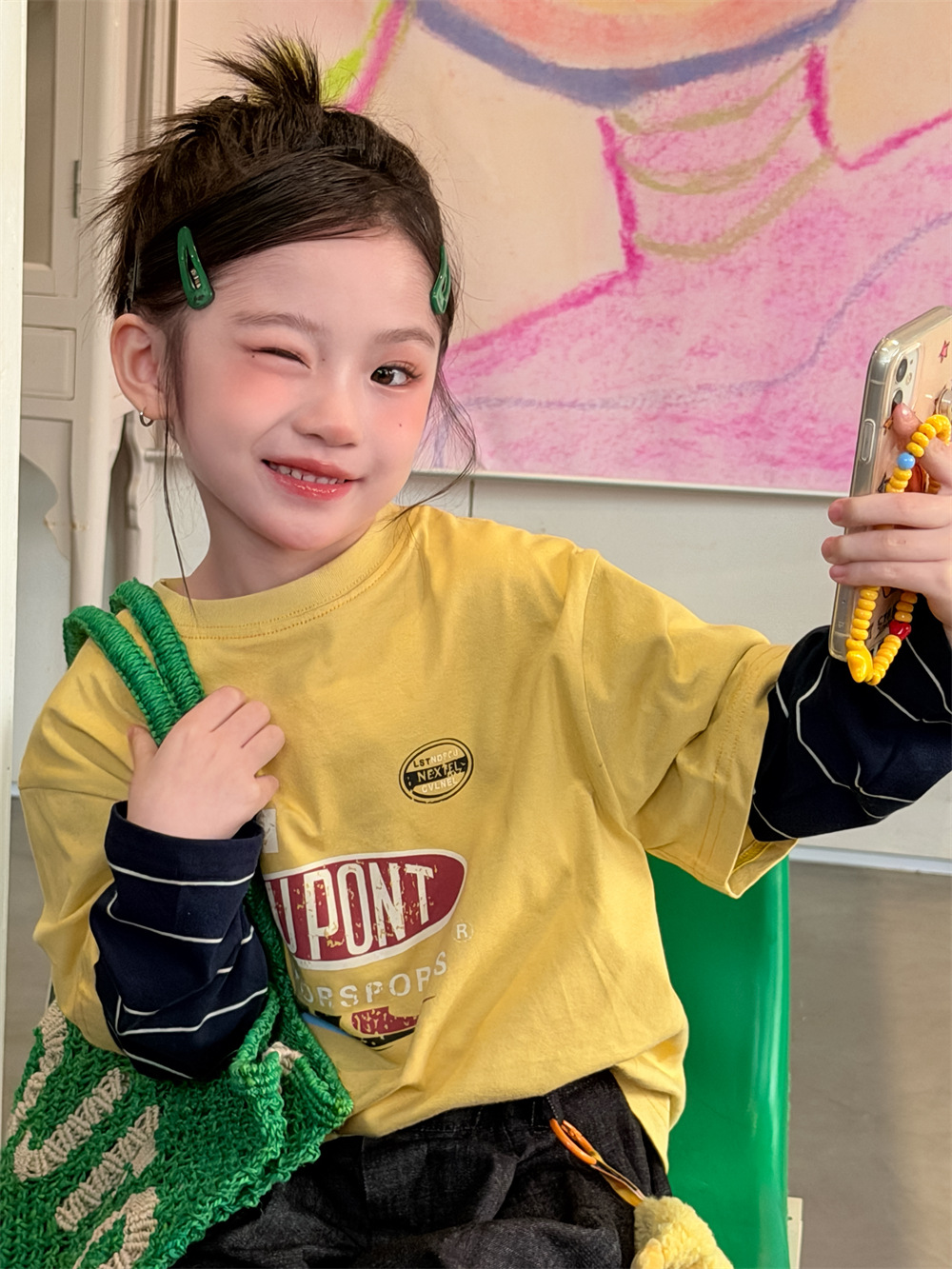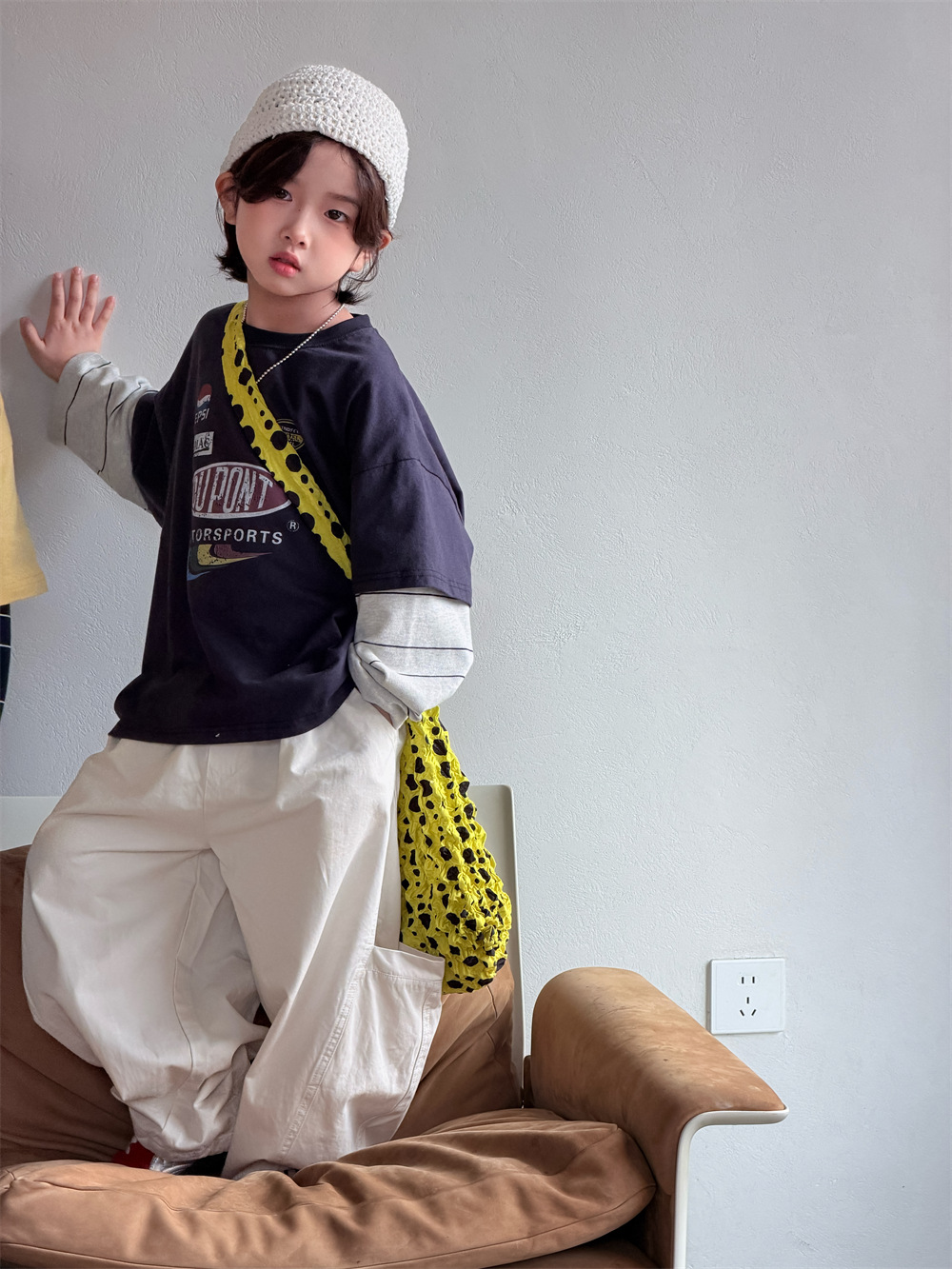 【90-150cm】Tシャツ フェイクレイヤード プリント 男女兼用 配色ボーダー袖 トップス
