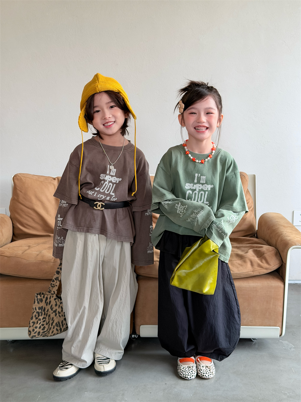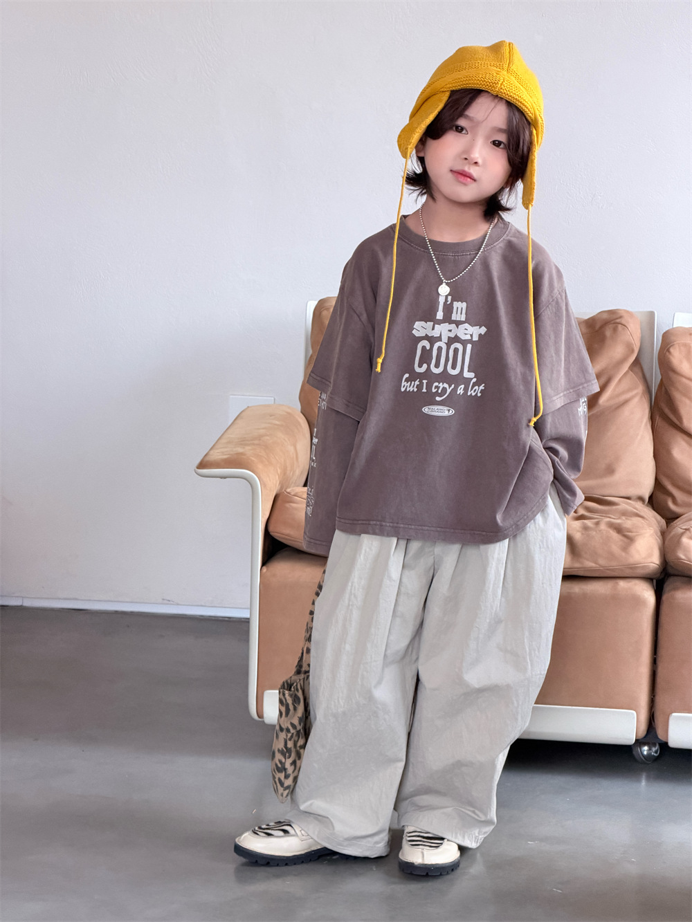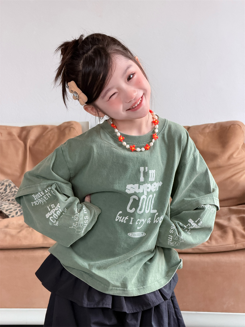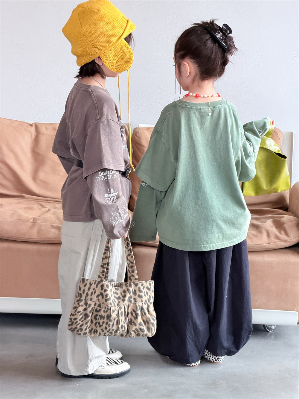 【90-150cm】長袖Tシャツ 男女兼用 フェイクレイヤード ウォッシュ加工 クルーネック トップス