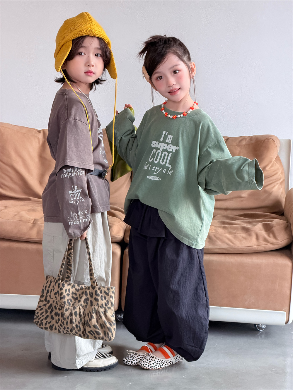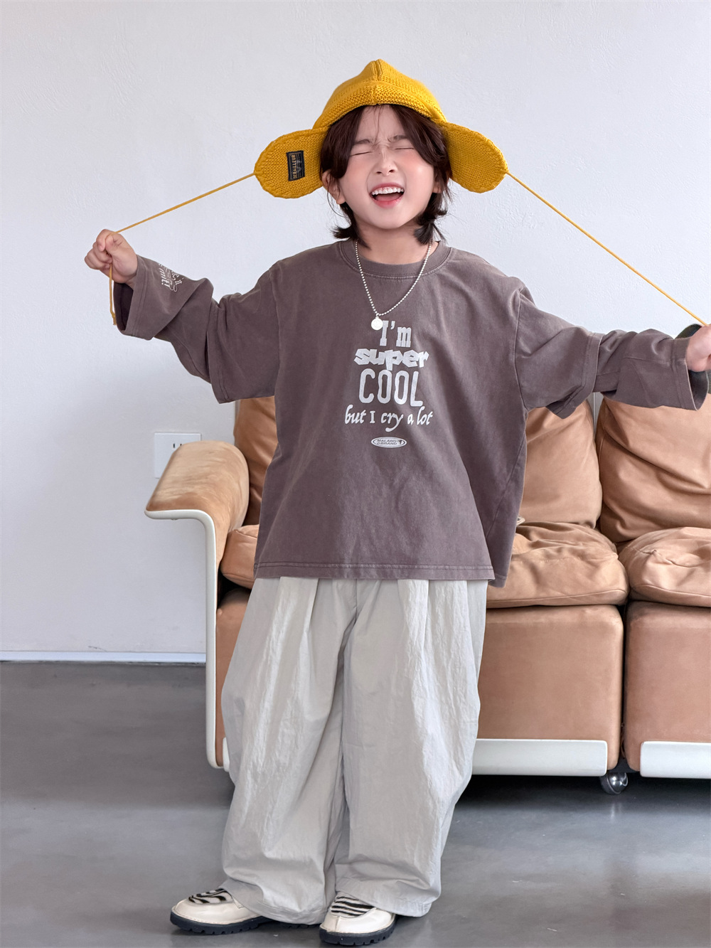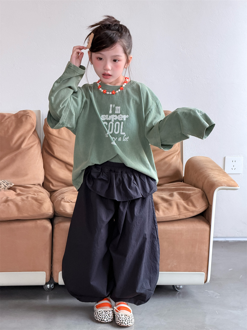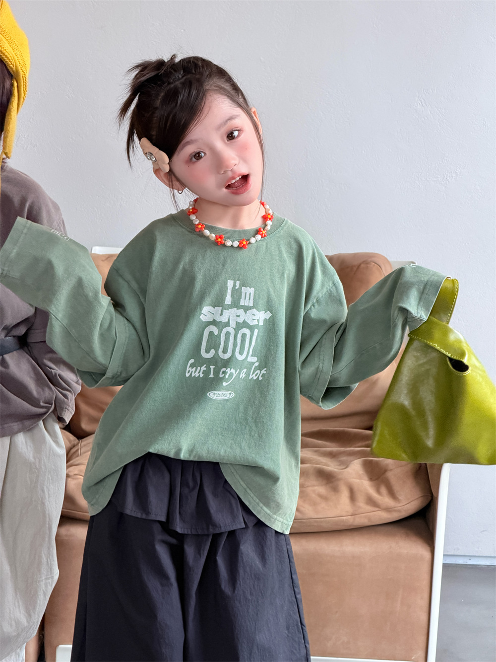 【90-150cm】長袖Tシャツ 男女兼用 フェイクレイヤード ウォッシュ加工 クルーネック トップス