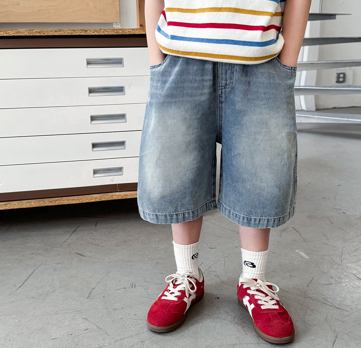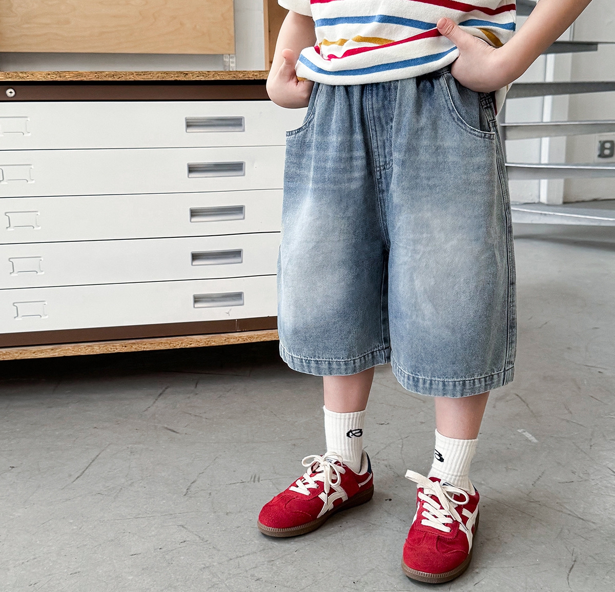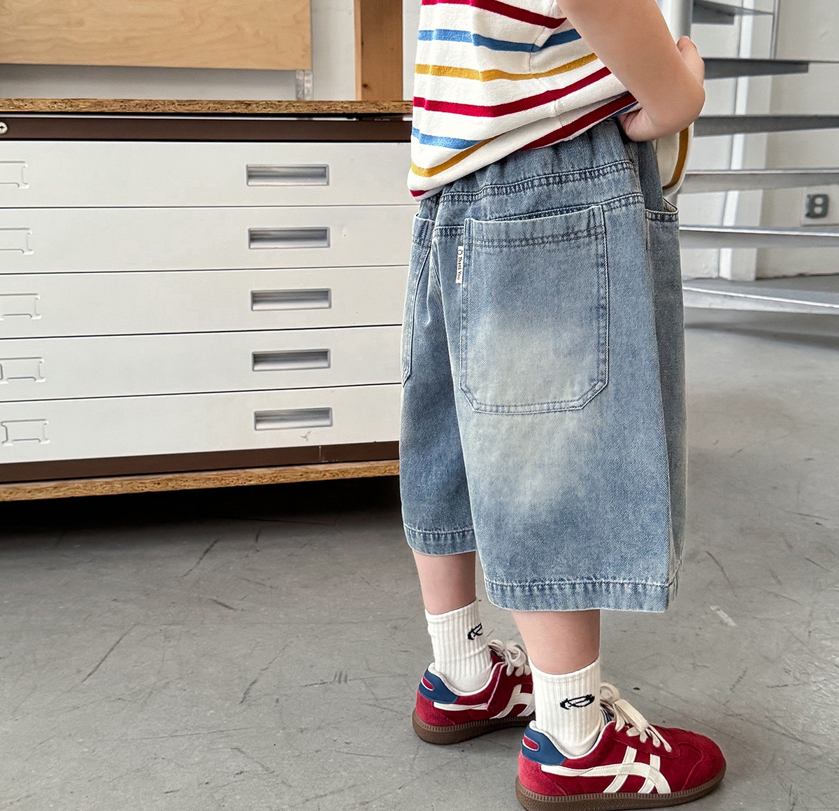 【90-150cm】デニムショートパンツ 男の子 バックポケットタグ ウォッシュ加工 カジュアル 子供服