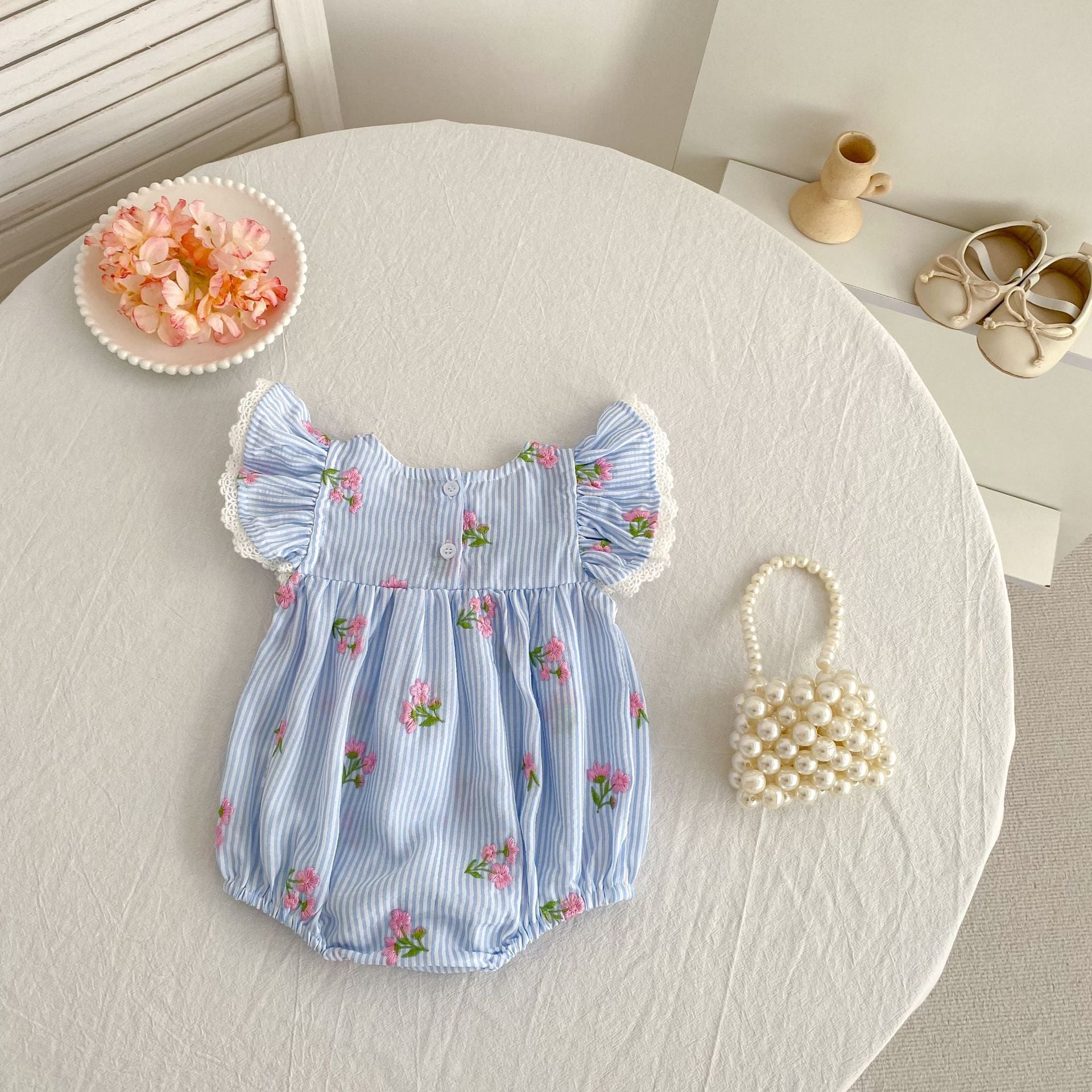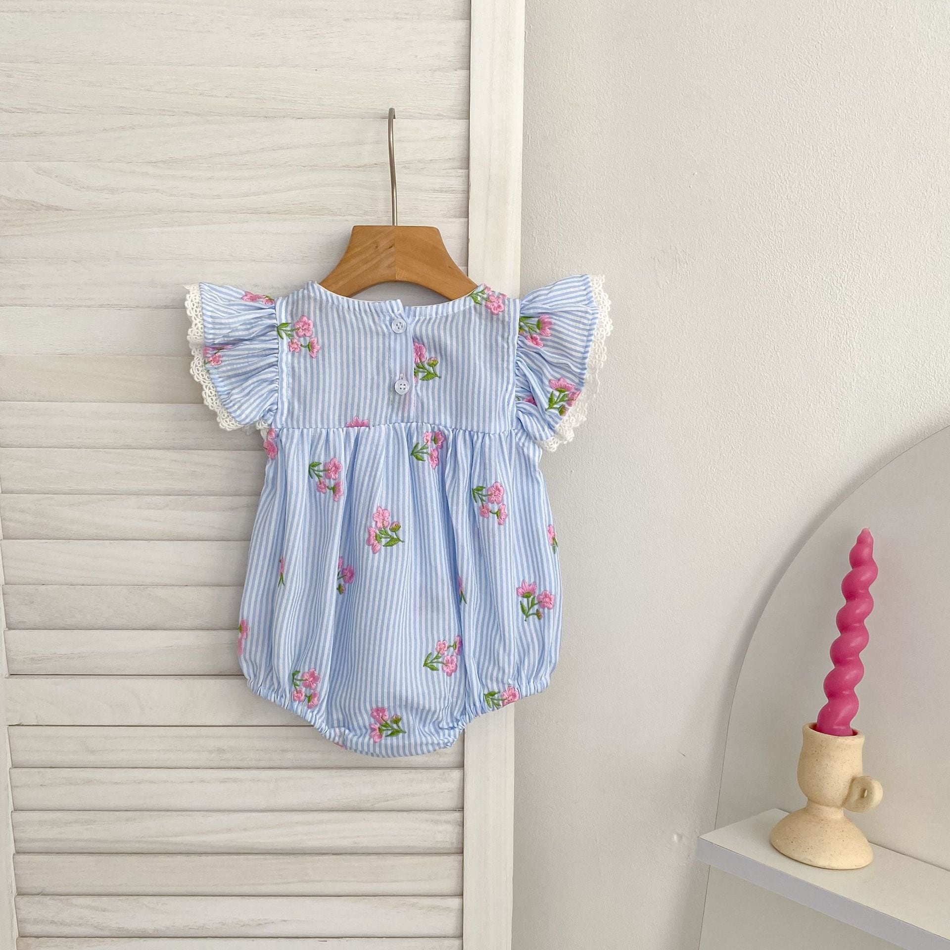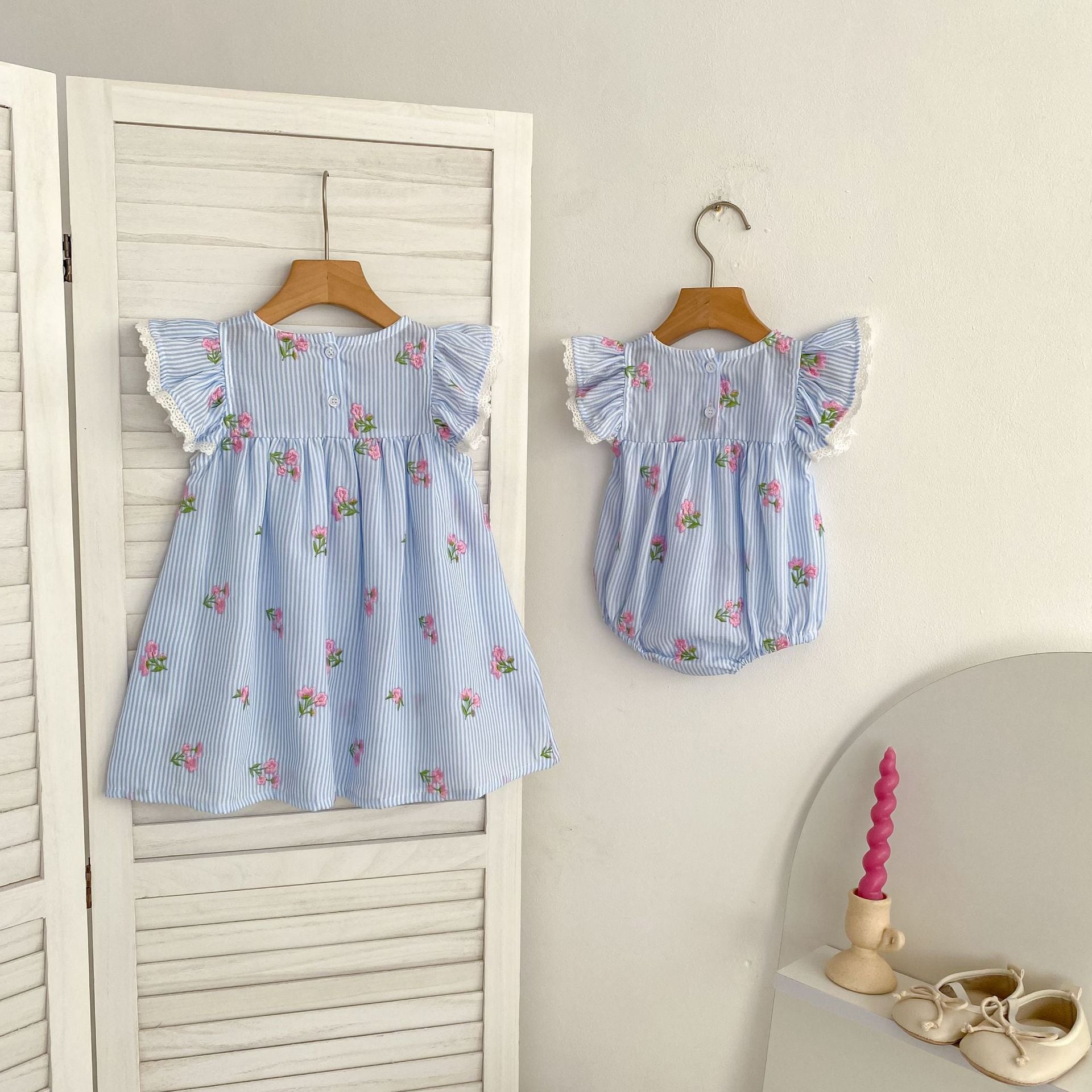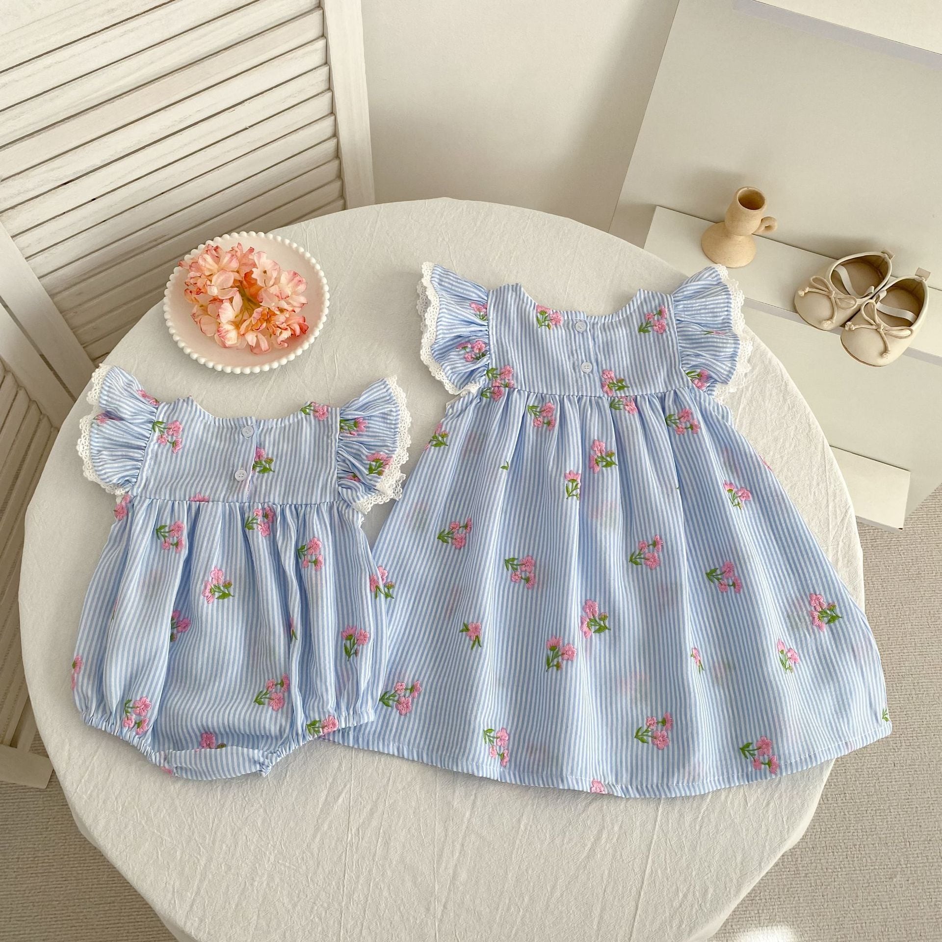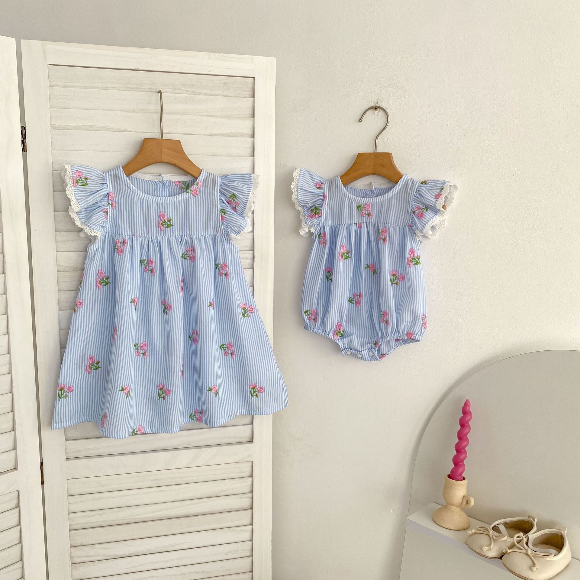 【66-130cm】ロンパース/ワンピース ブルーストライプ フリル 姉妹服