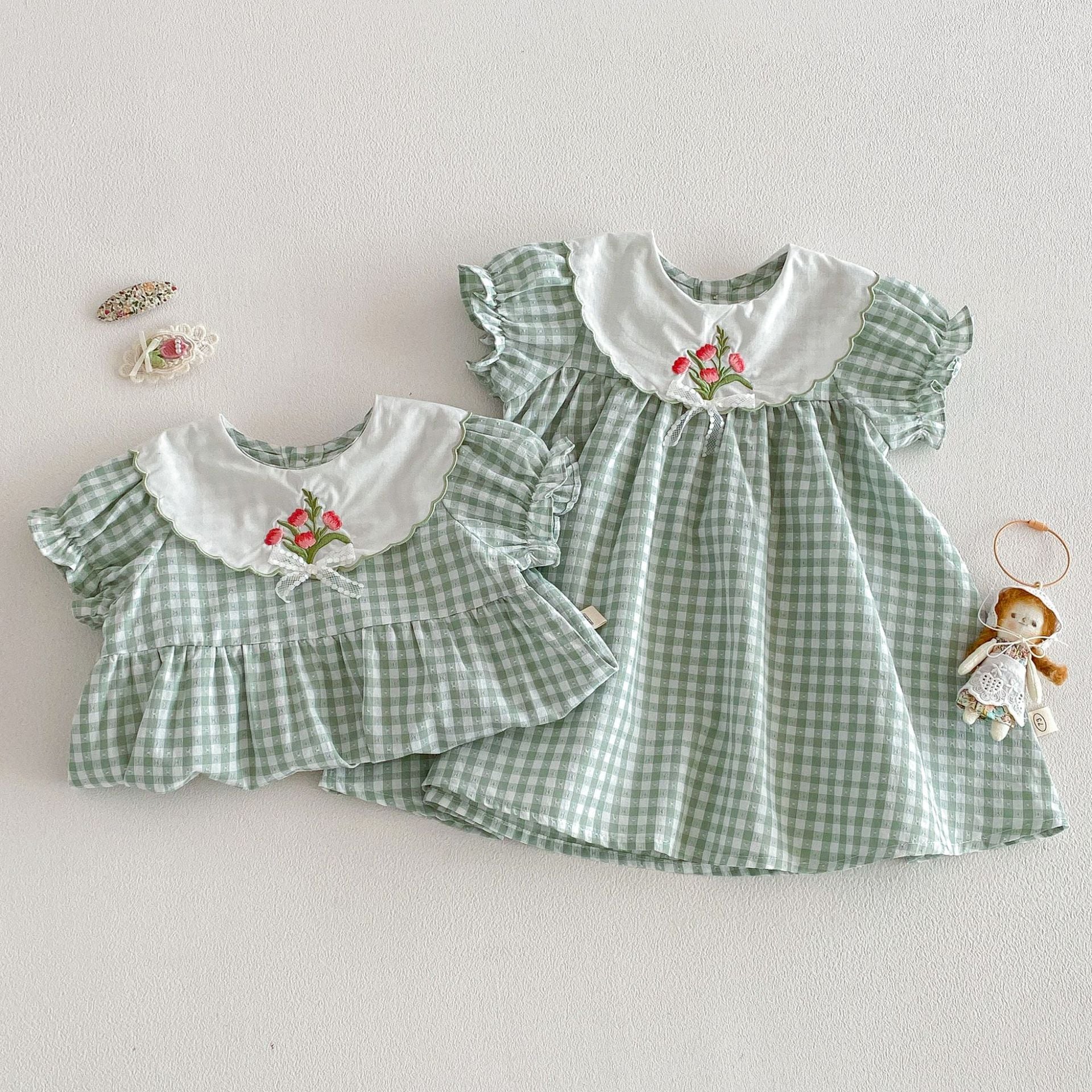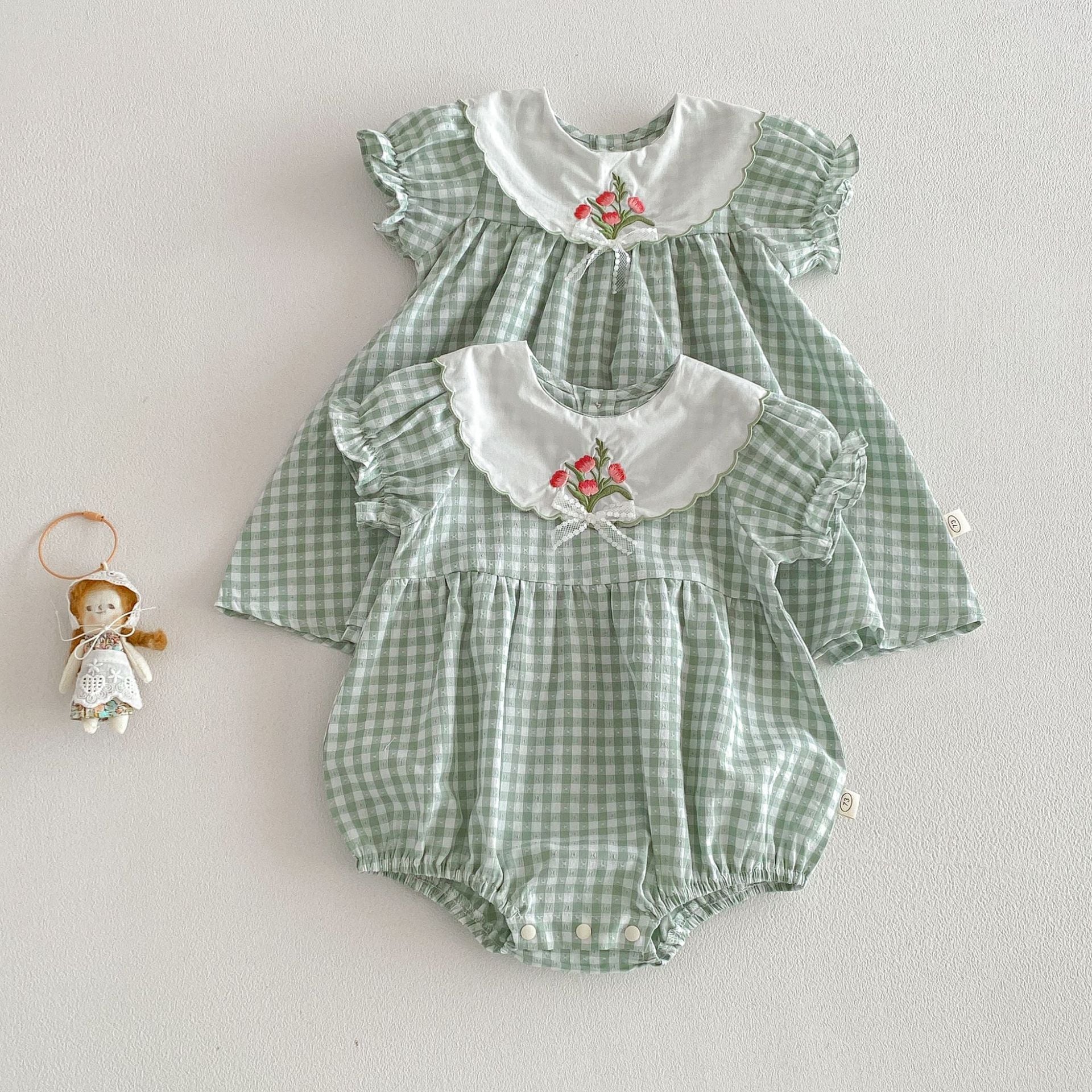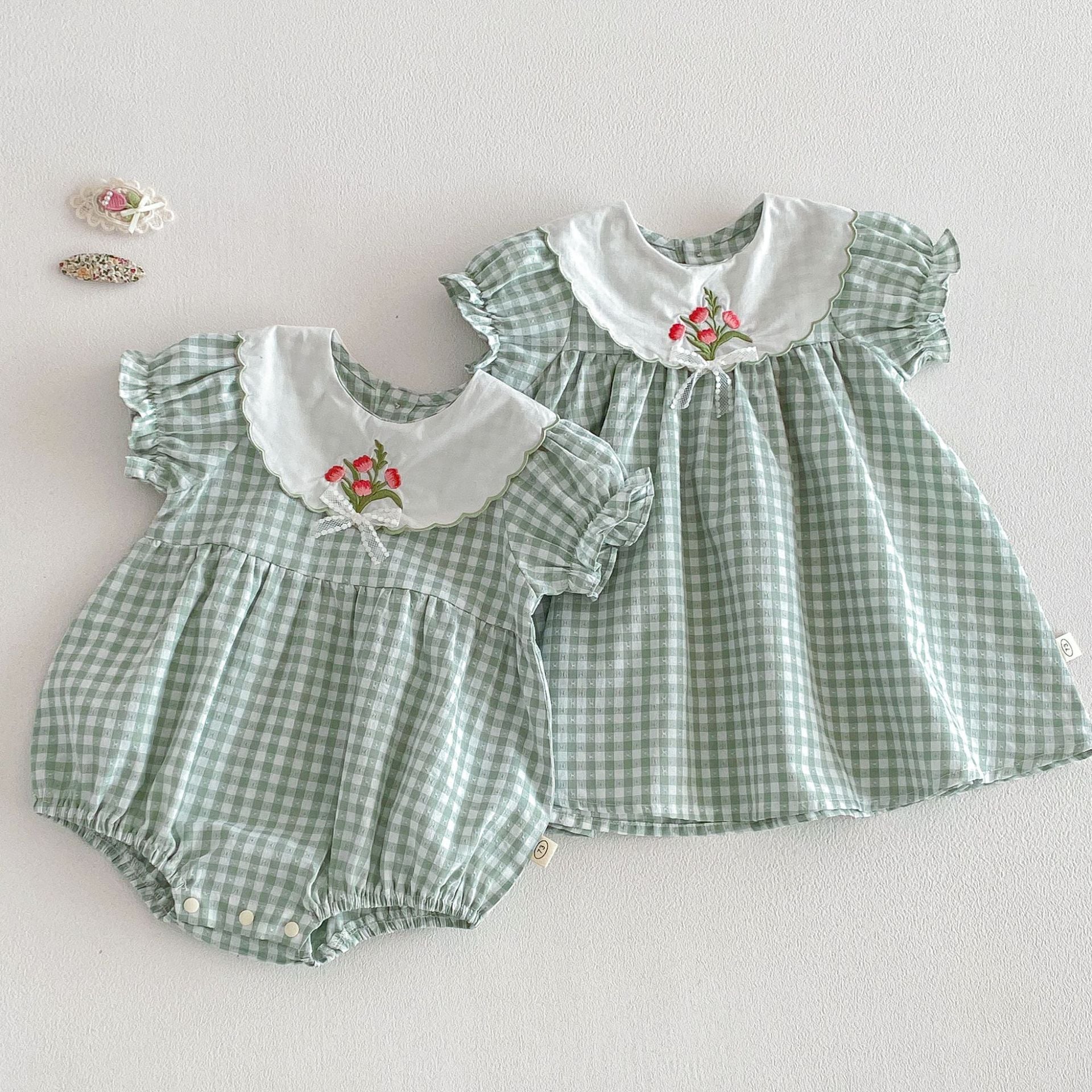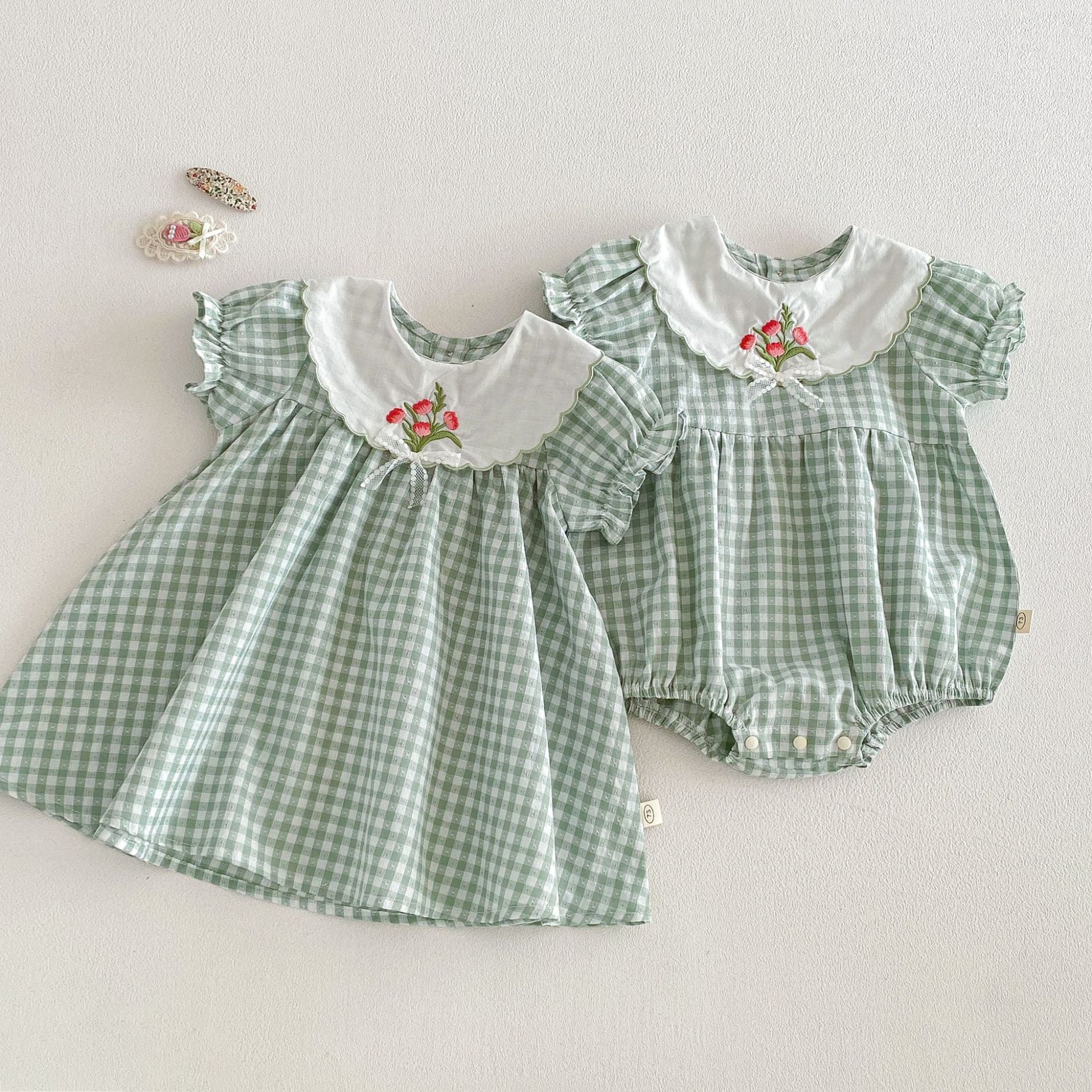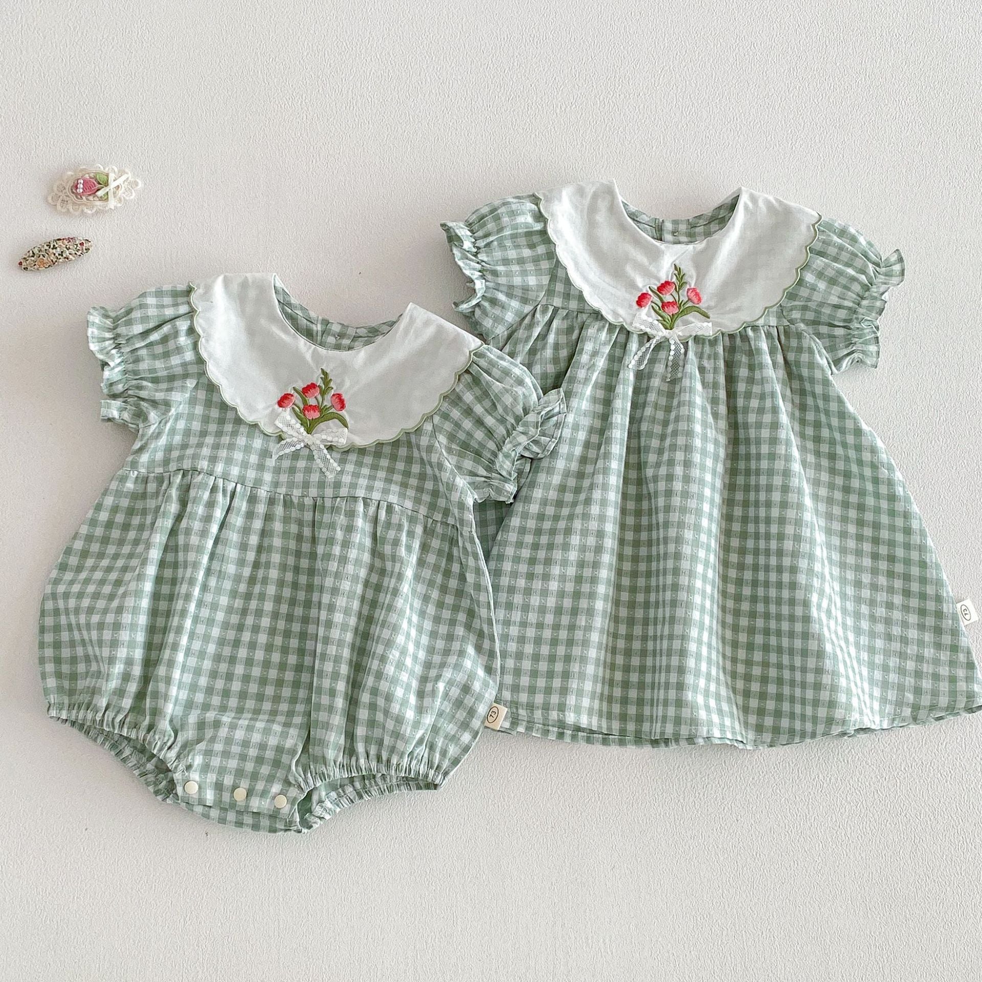 【66-110cm】ロンパースorワンピース グリーンチェック 姉妹服
