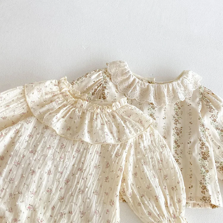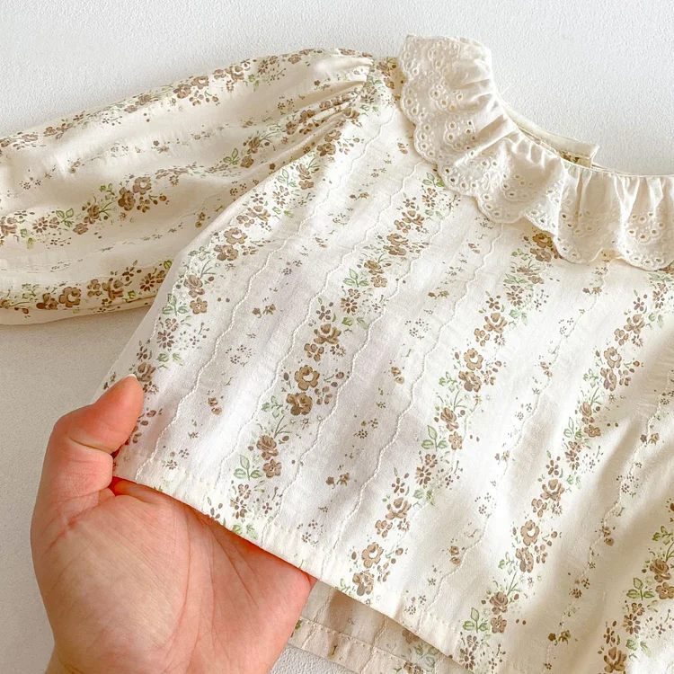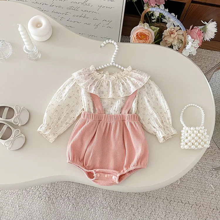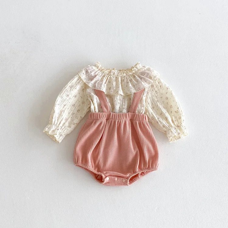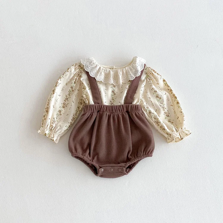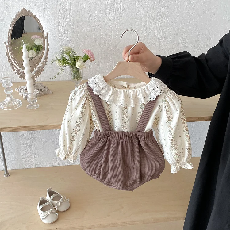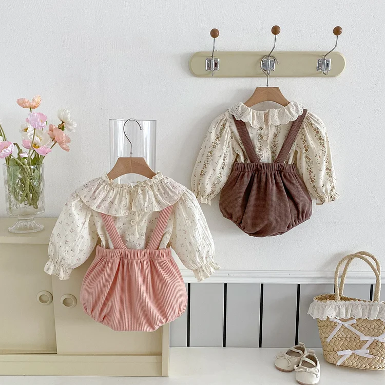 【66-100cm】 丸襟 小花柄 トップス & サロペット ロンパース