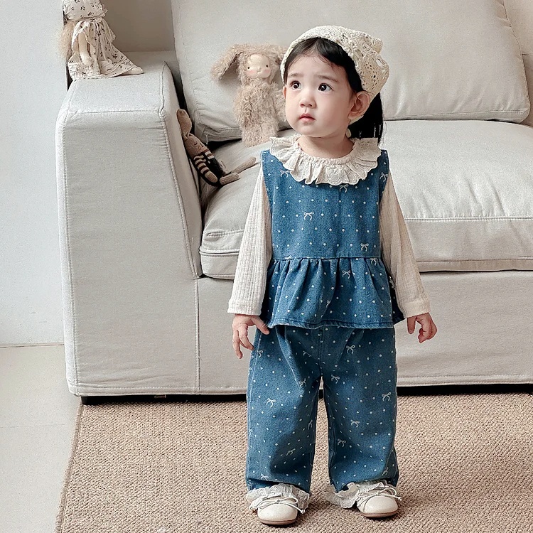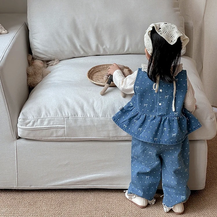 【73-100cm】ベビー 女の子 デニム セットアップ リボン付き 可愛い 上下2点セット