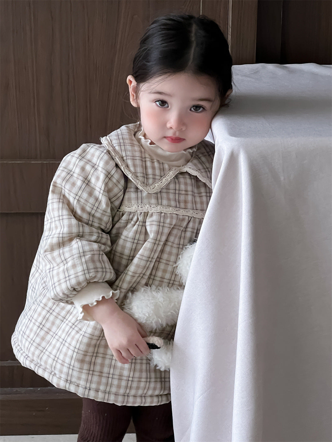 【73-100cm】レース チェックの厚手 ワンピース