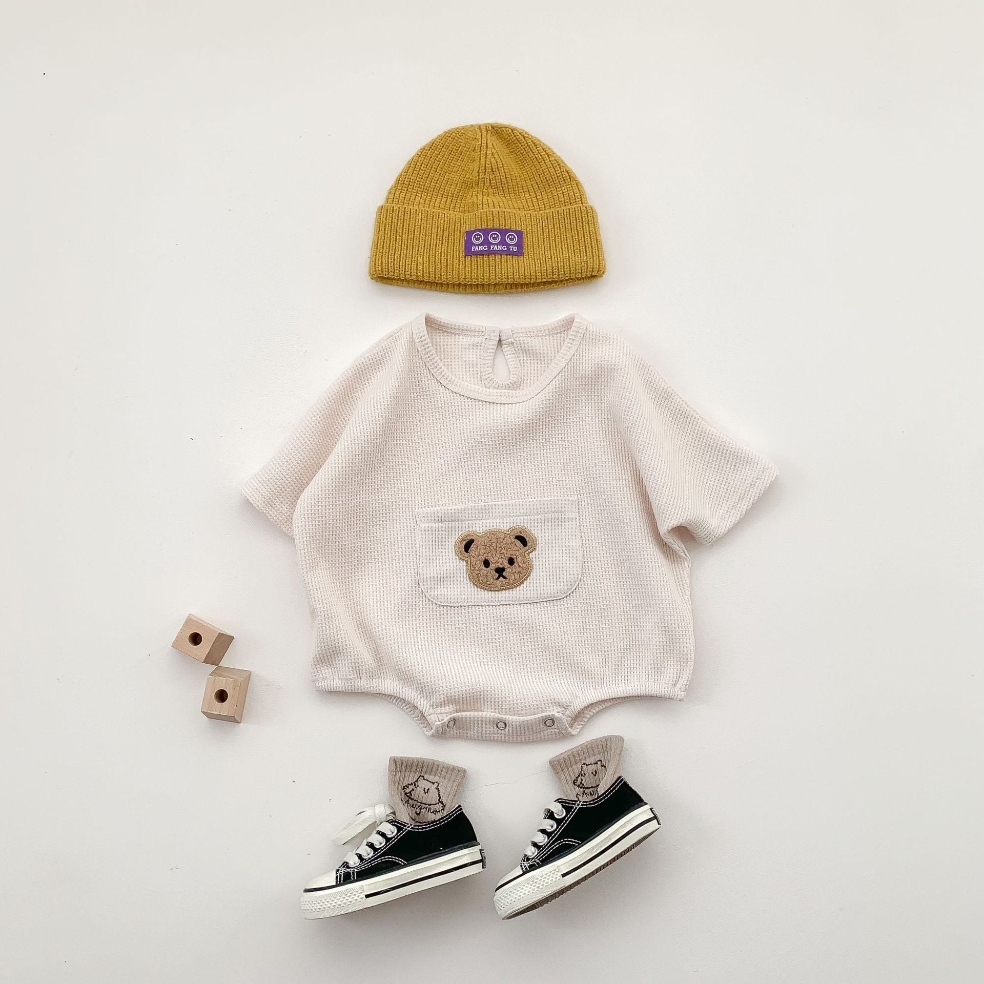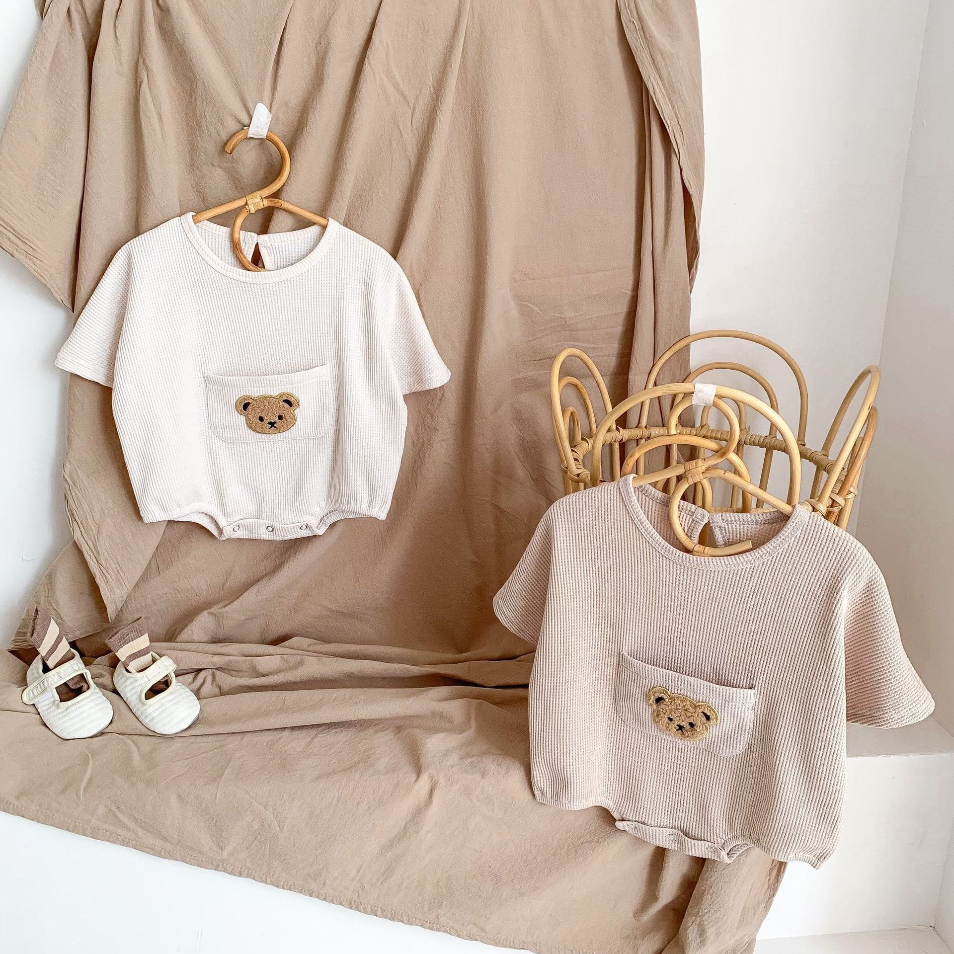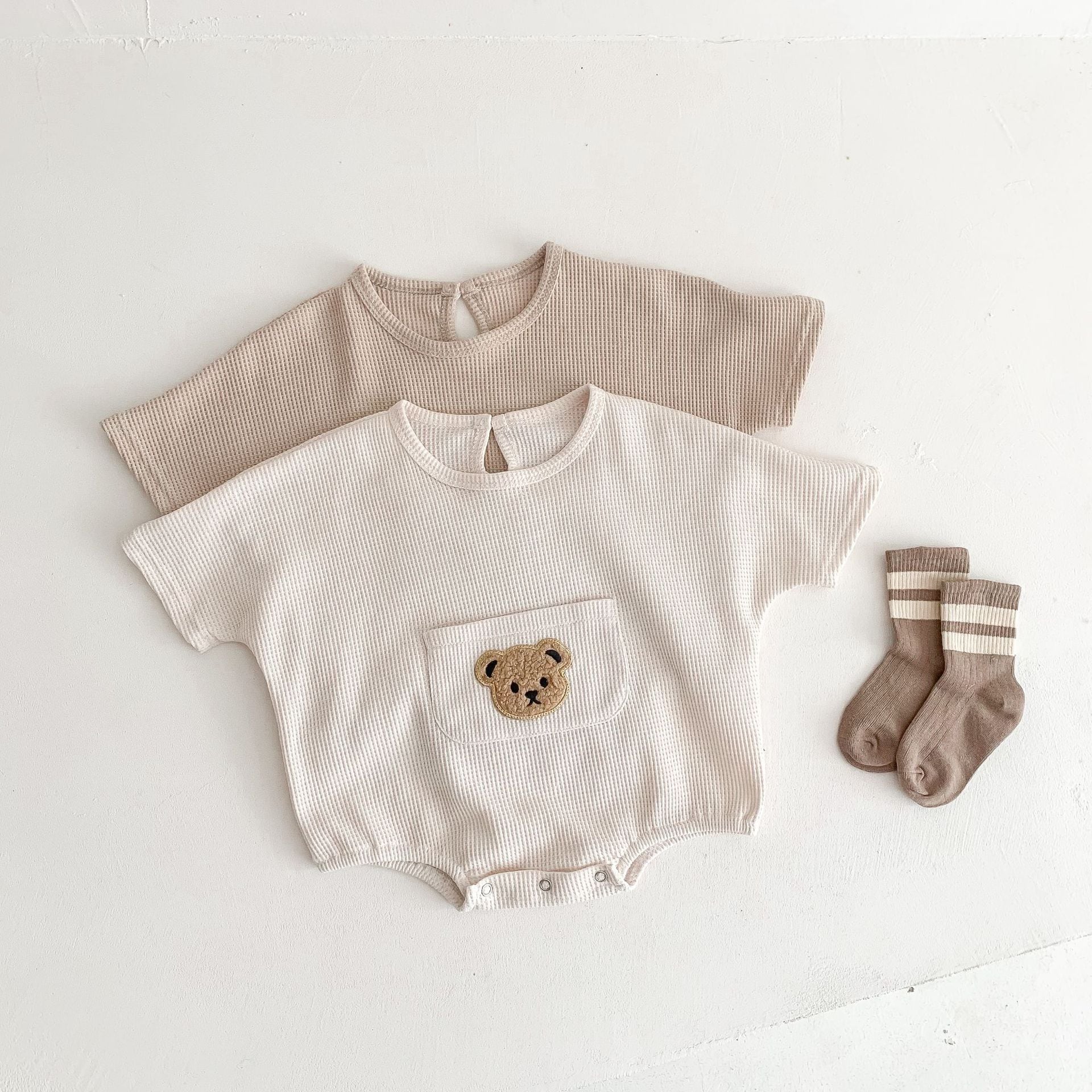 【66-90cm】ロンパース クマ柄 ポケット付き 半袖 ベビー服