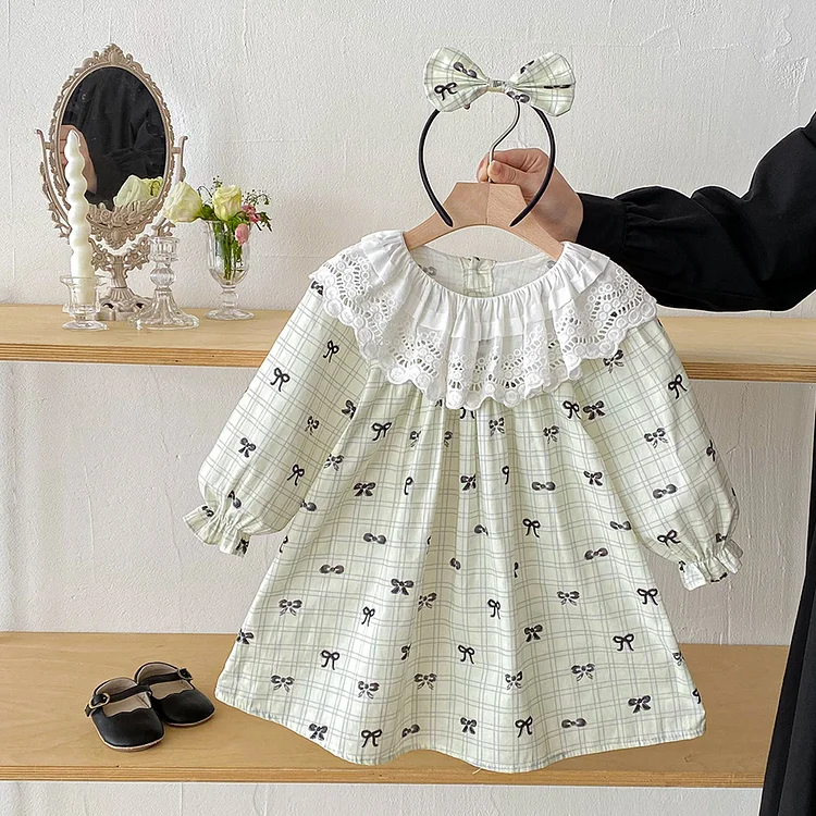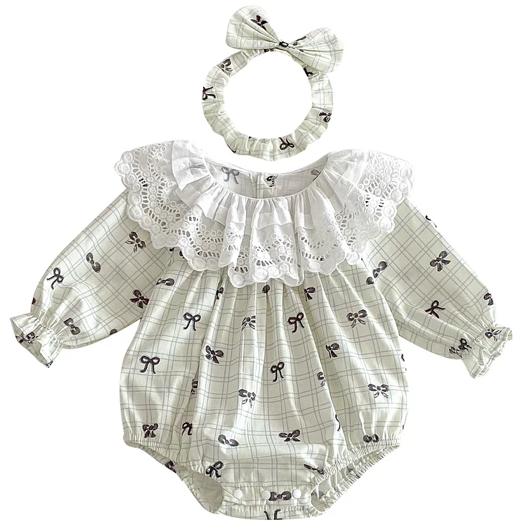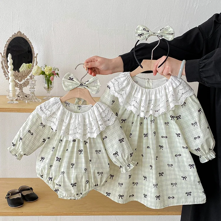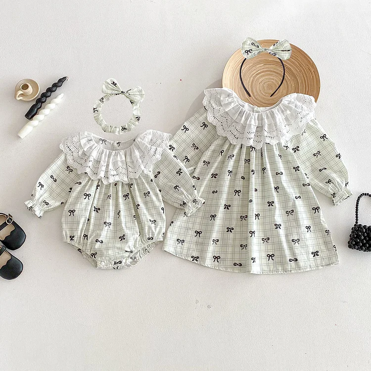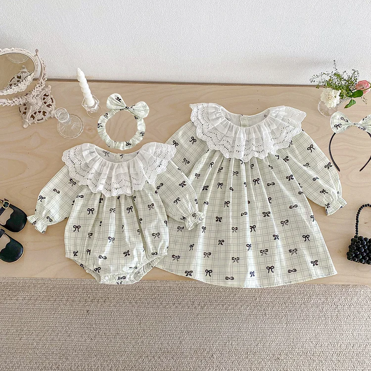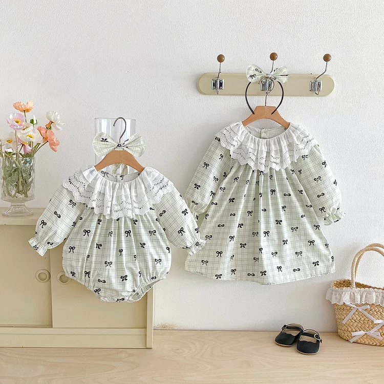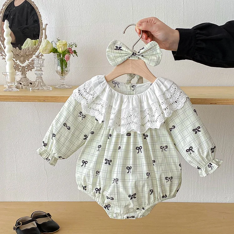 【66-140cm】ワンピース OR ロンパースレース襟リボン柄 可愛い