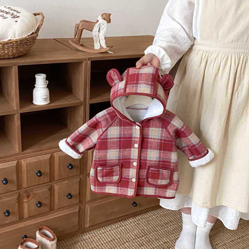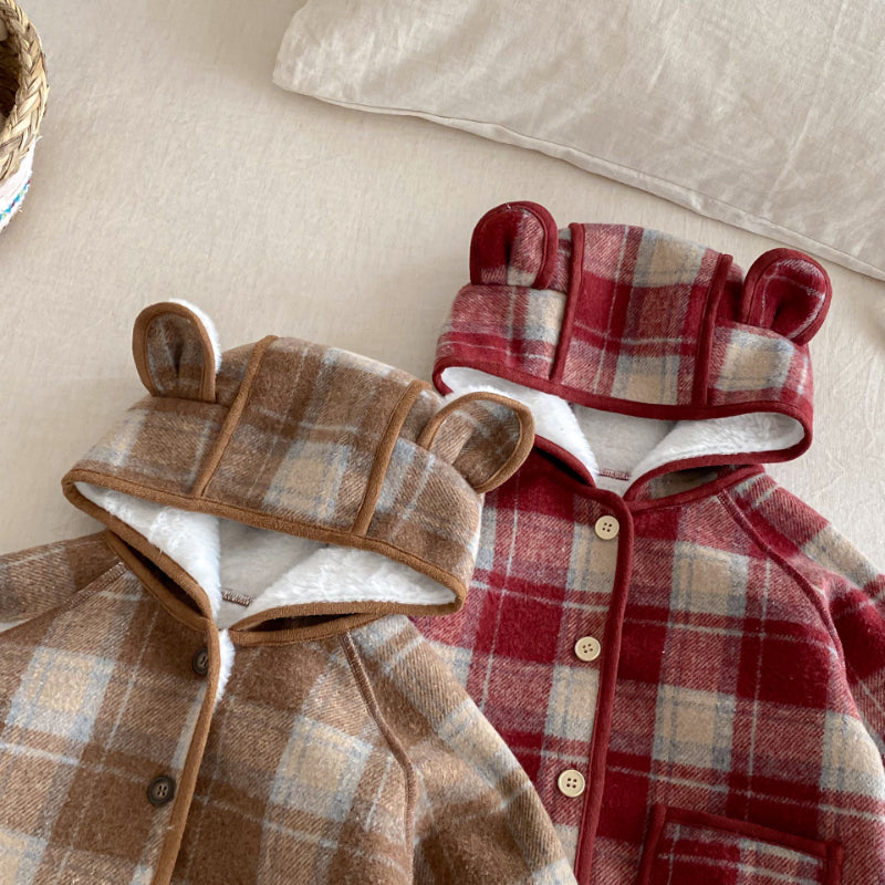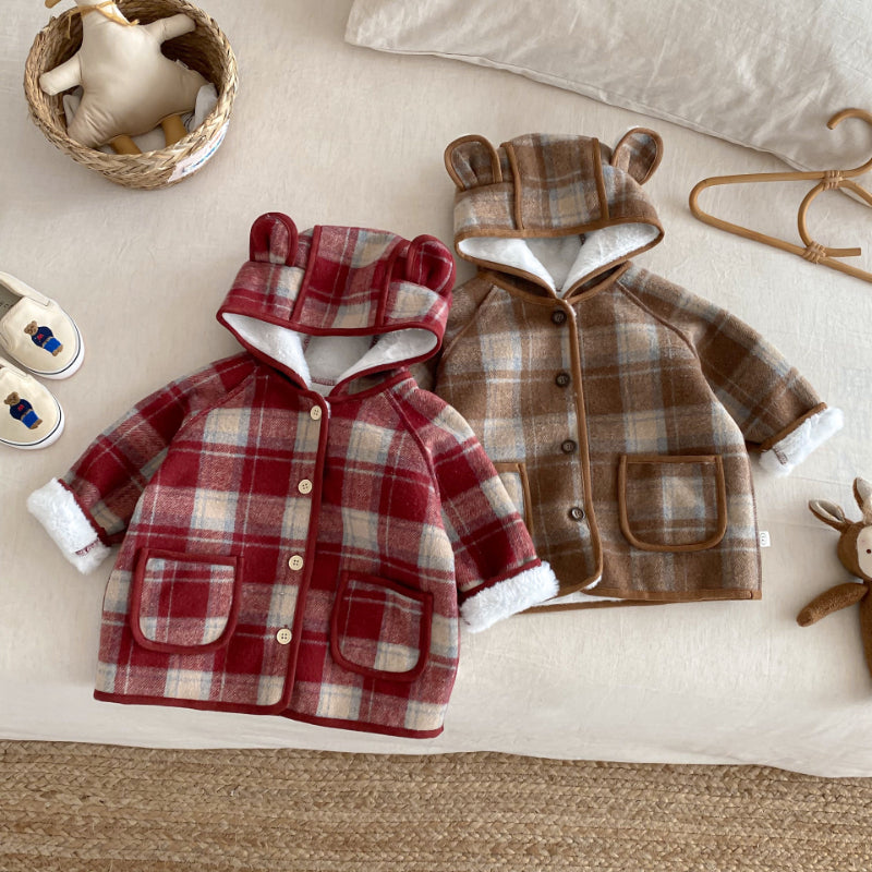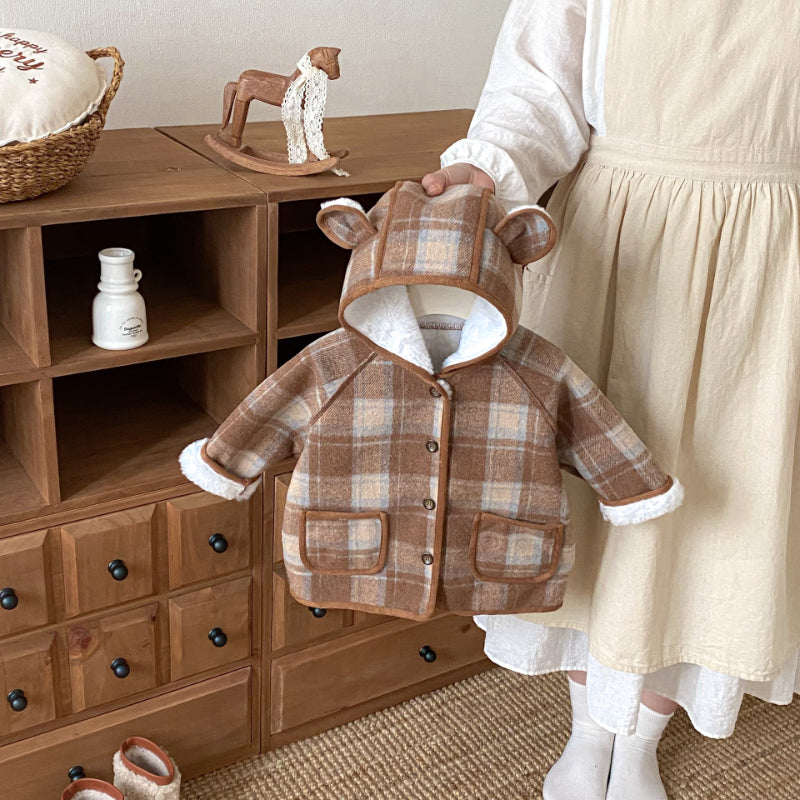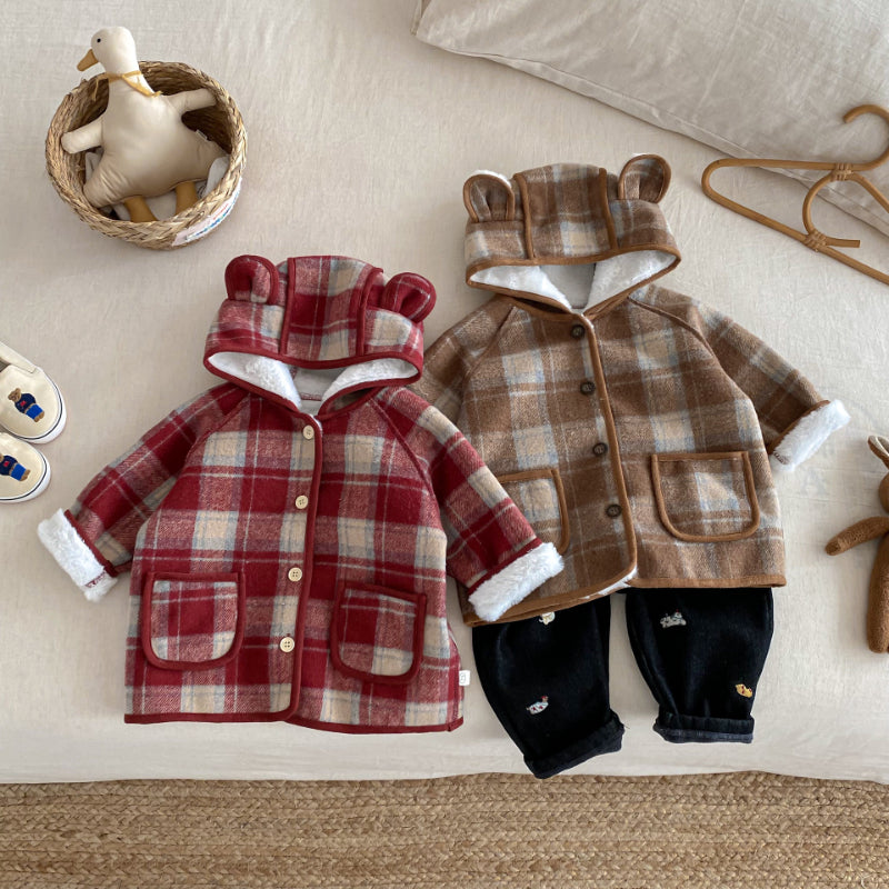【73-120cm】 チェック柄 フード付き モコモコ アウター