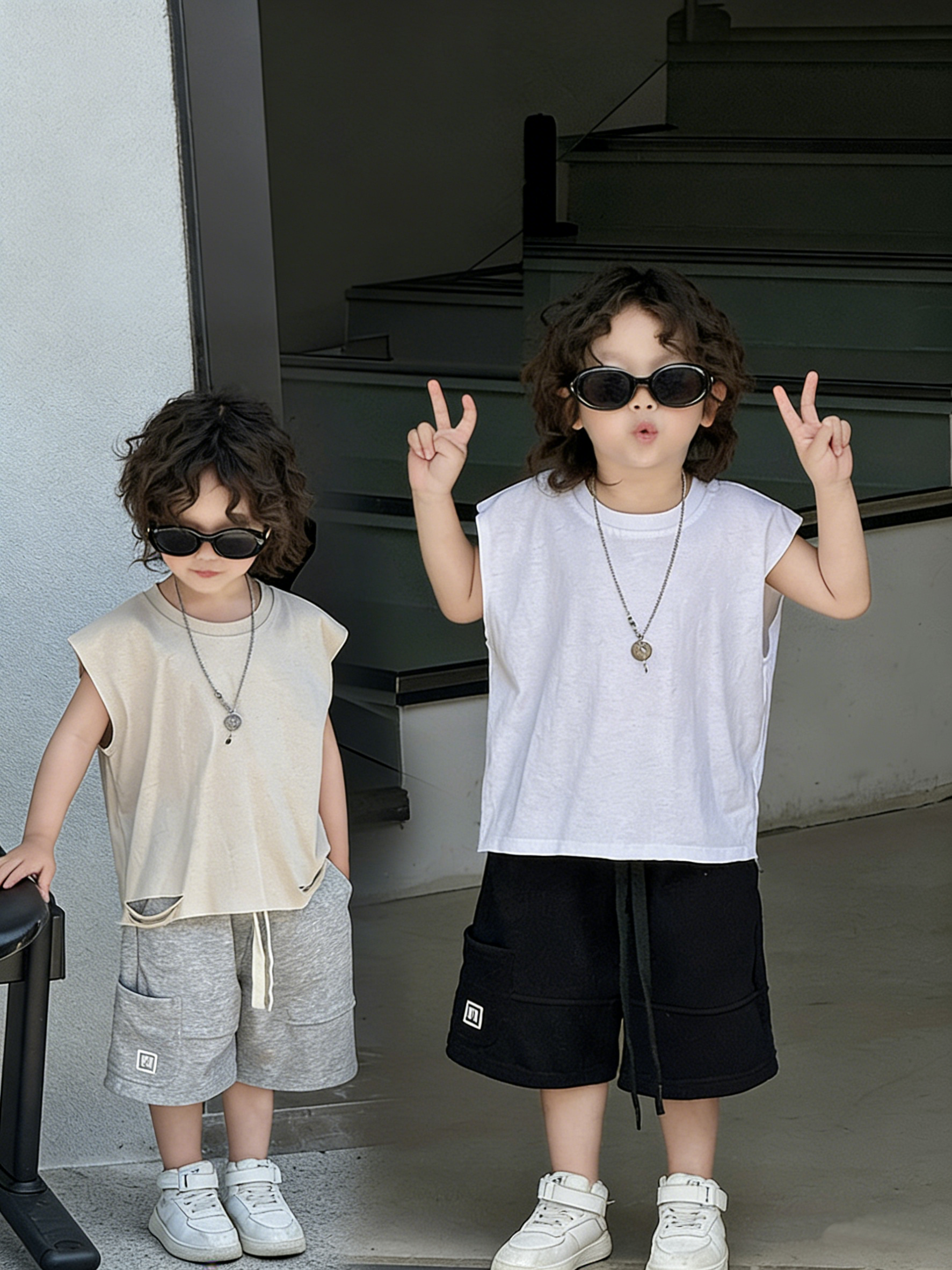 【90-140cm】Tシャツ 男の子 ノースリープ 無地 ストリート風