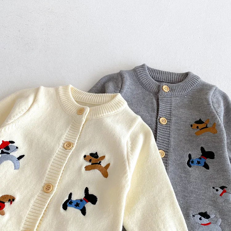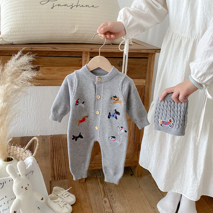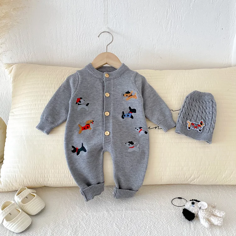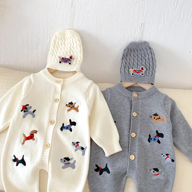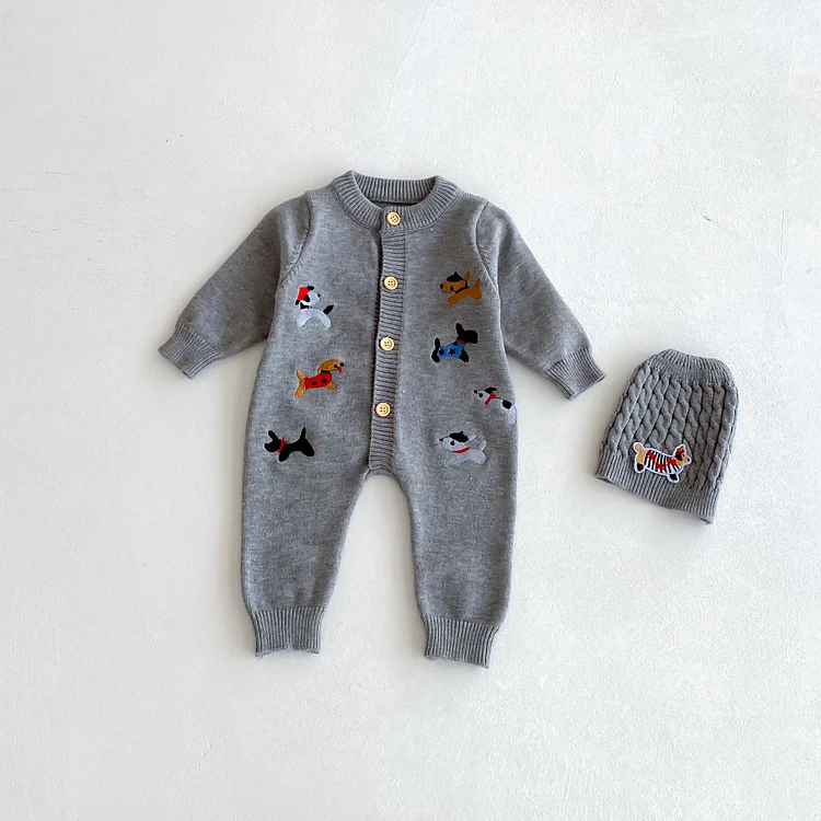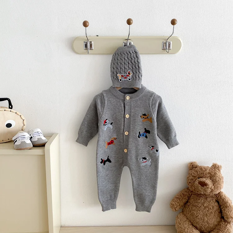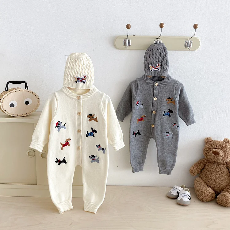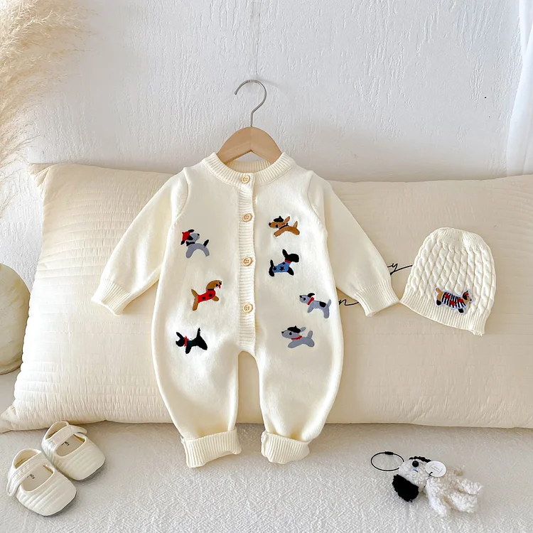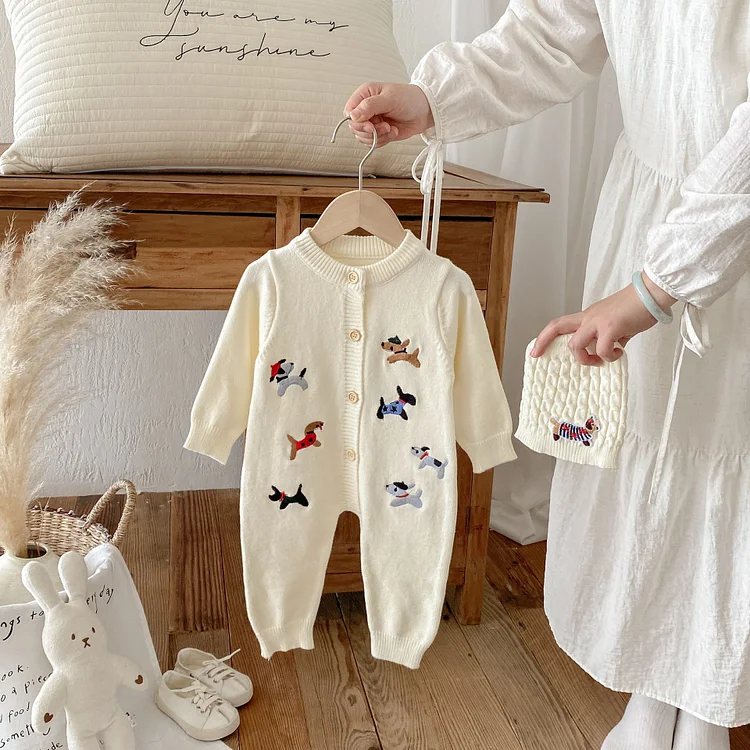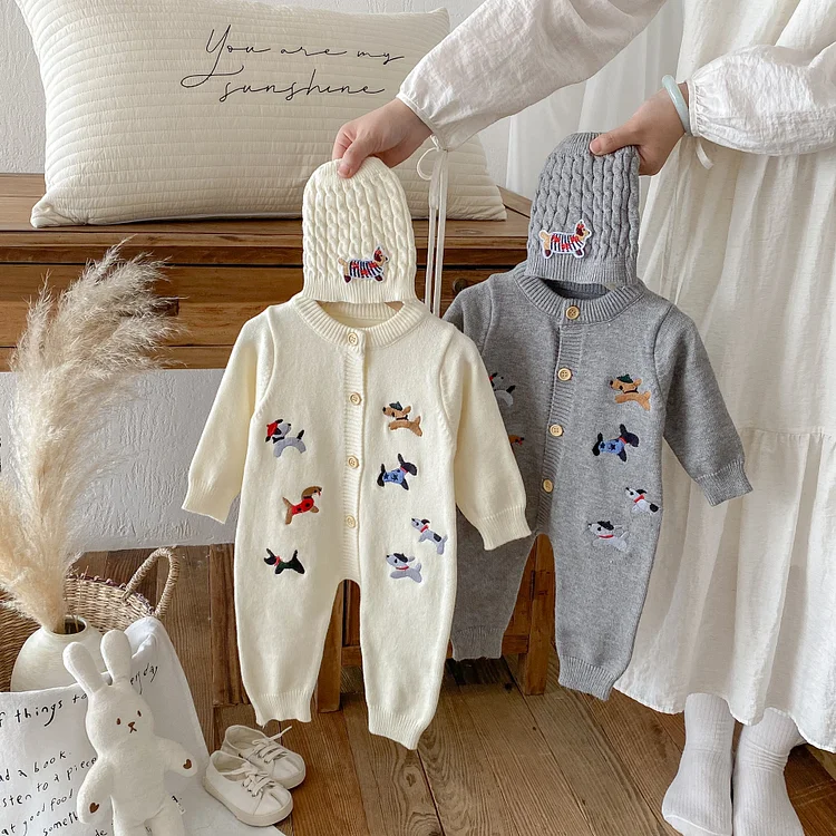 【66-90cm】 帽子付き 犬刺しゅう オールインワン