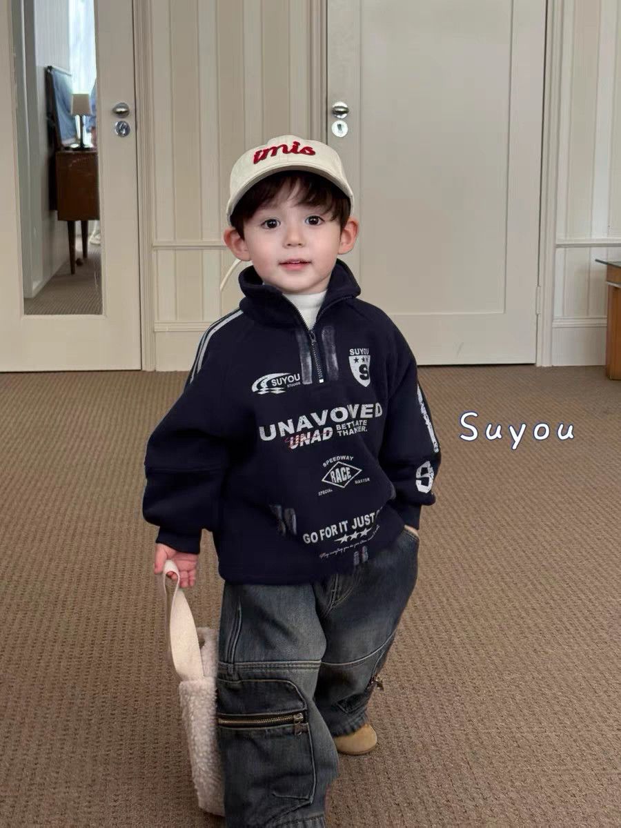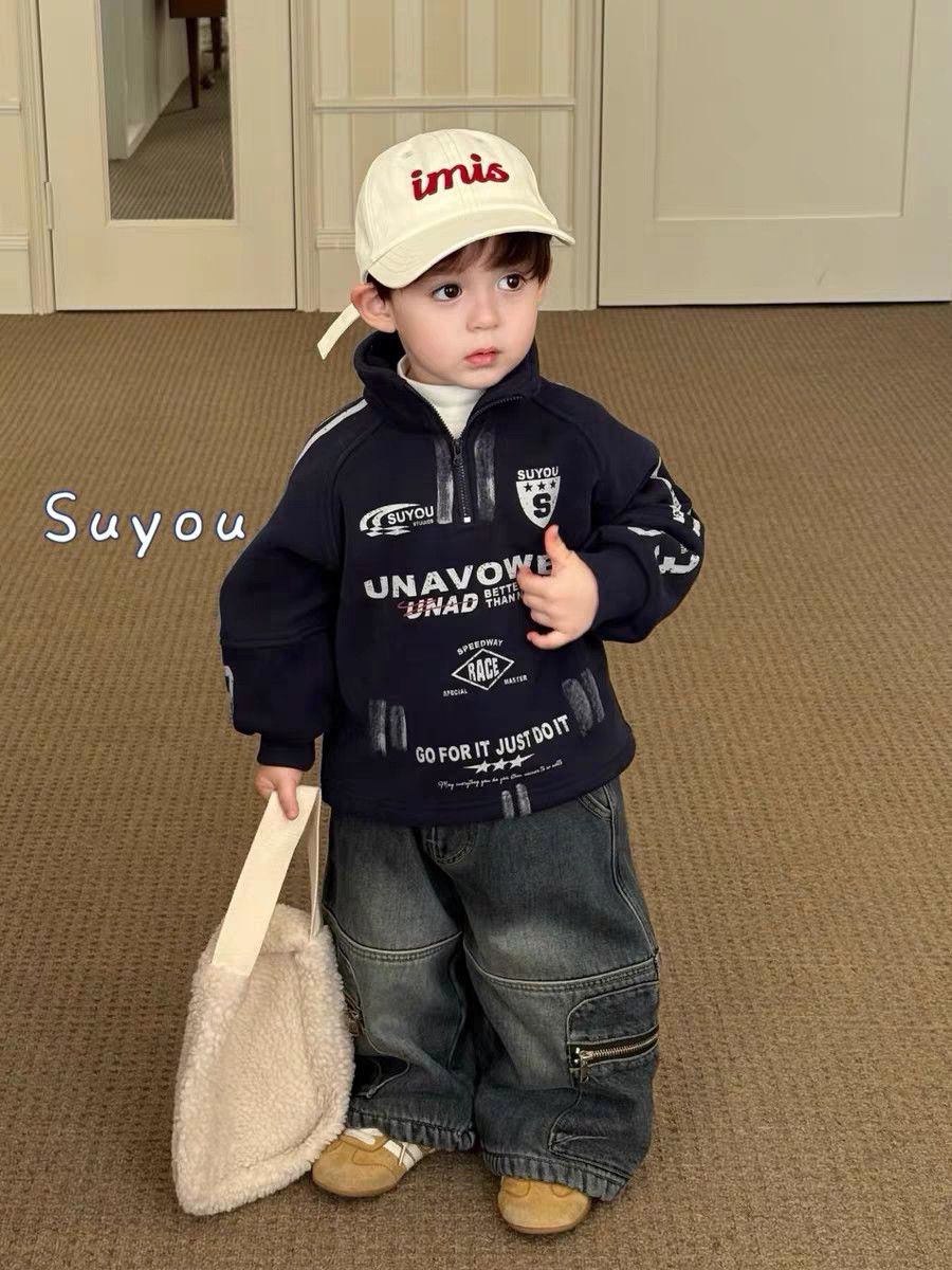 【90-140cm】クール 裏起毛 スタンドネック トレーナー/デニムパンツ