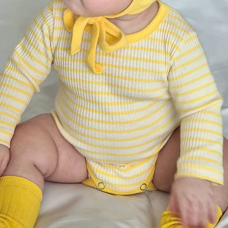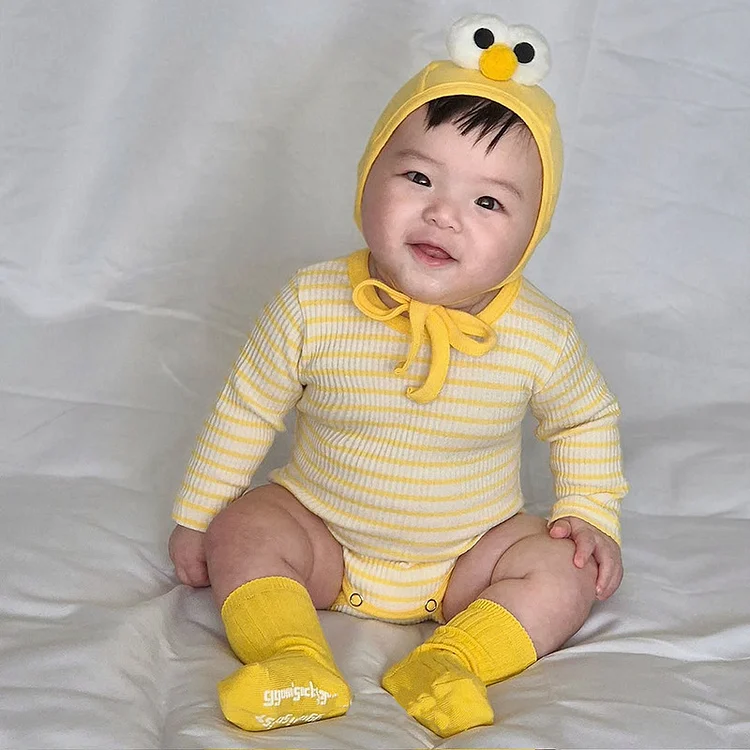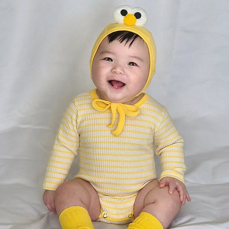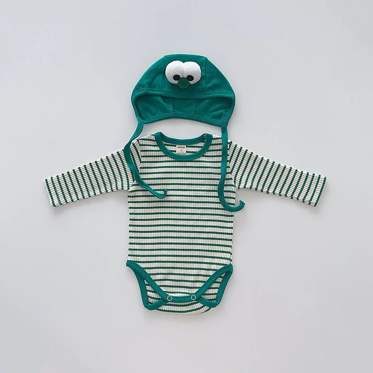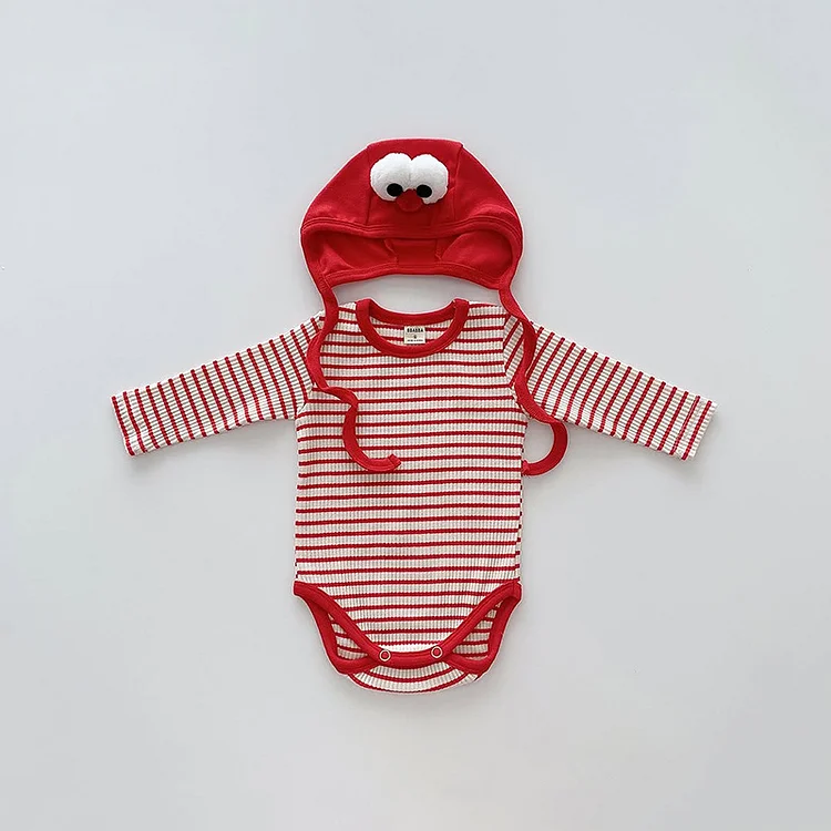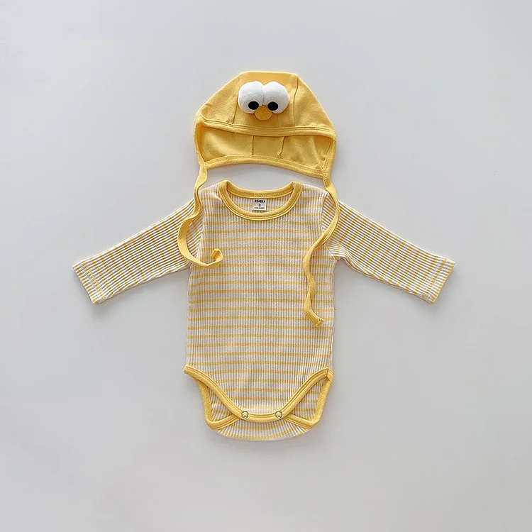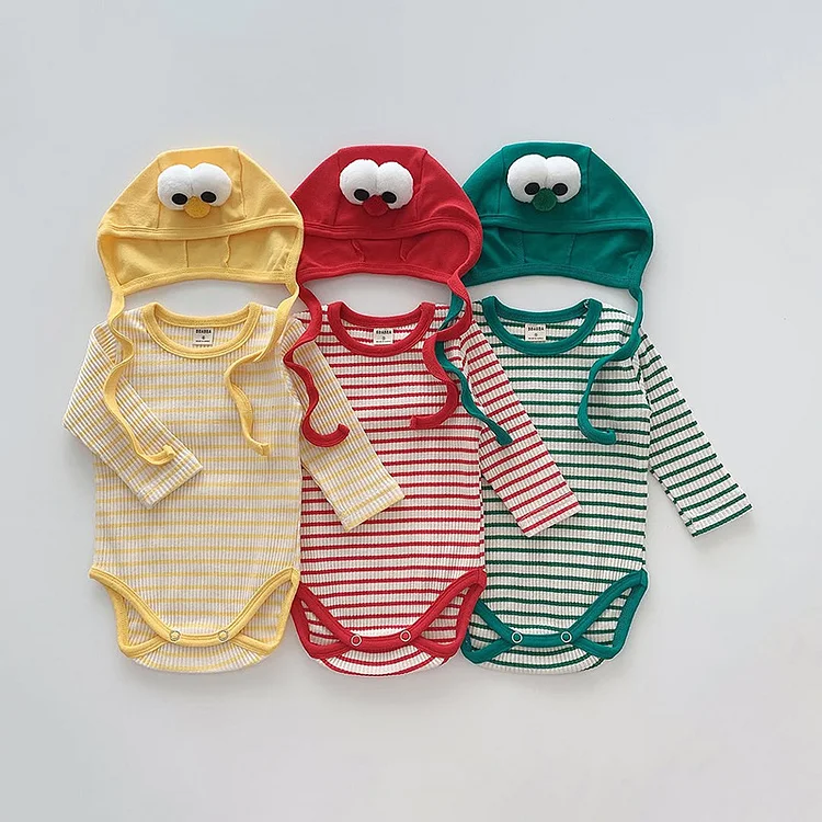 【66-90cm】帽子付き 目デザインボーダー ロンパース