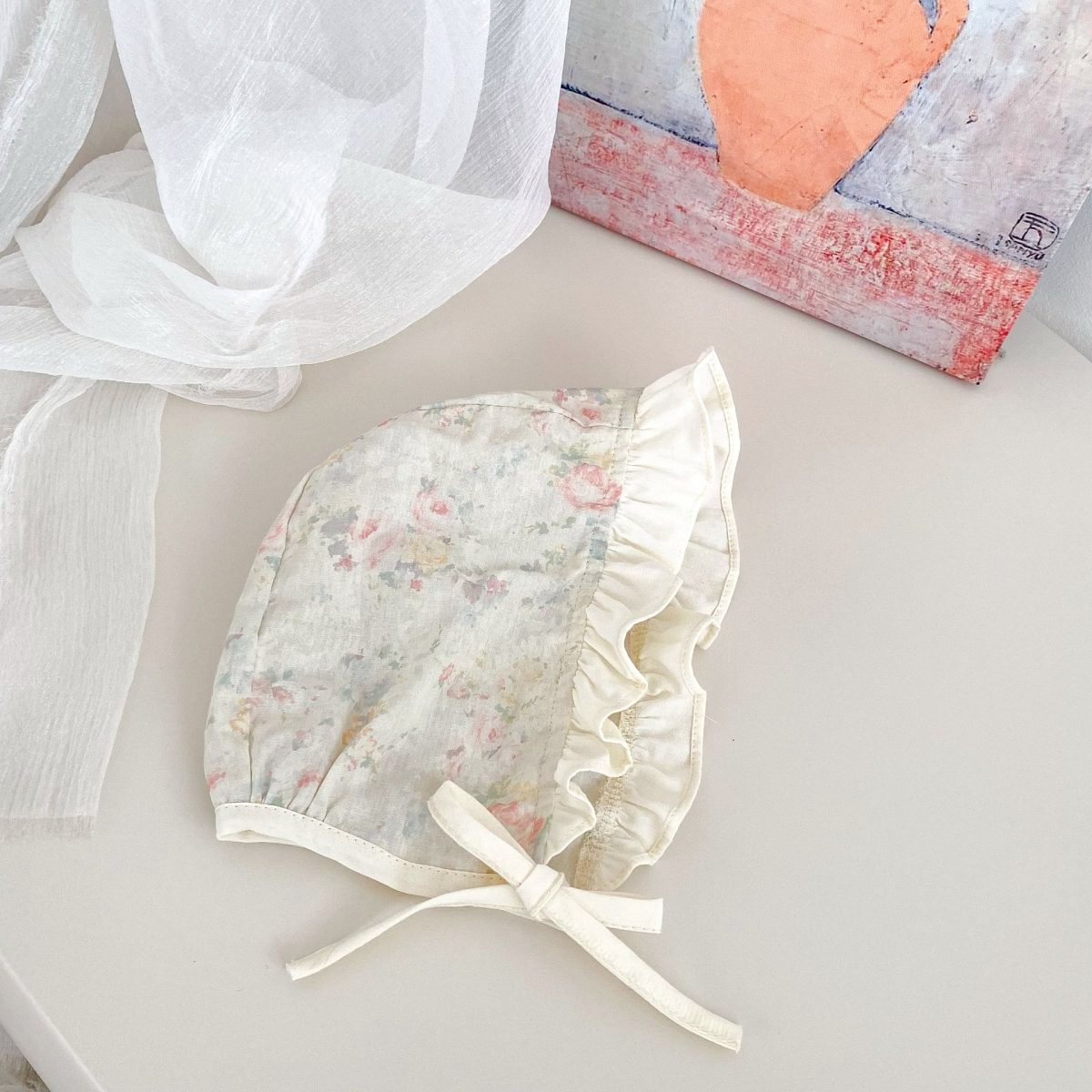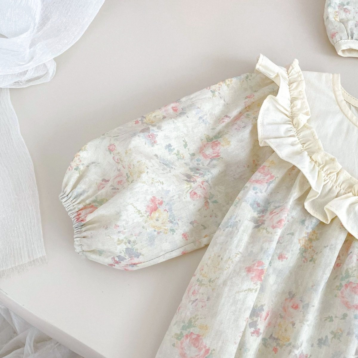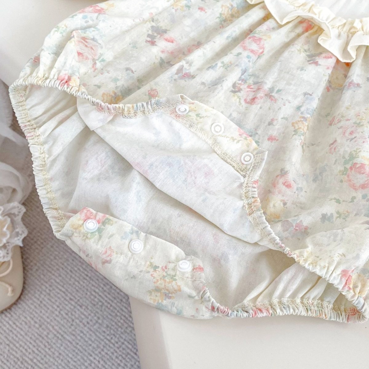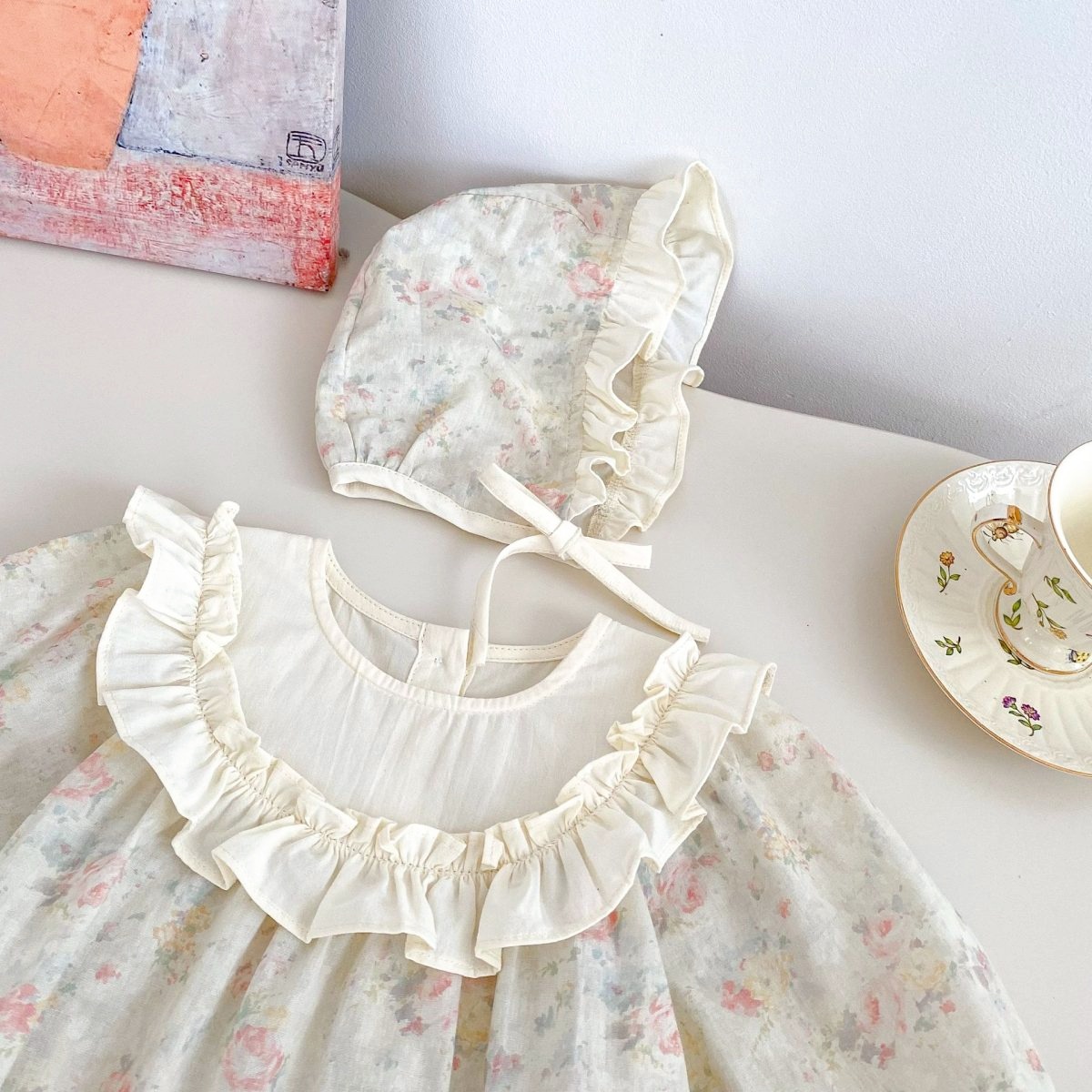 【66-90cm】ベビー 女の子 小花柄 レトロ フリル 帽子付き ロンパース