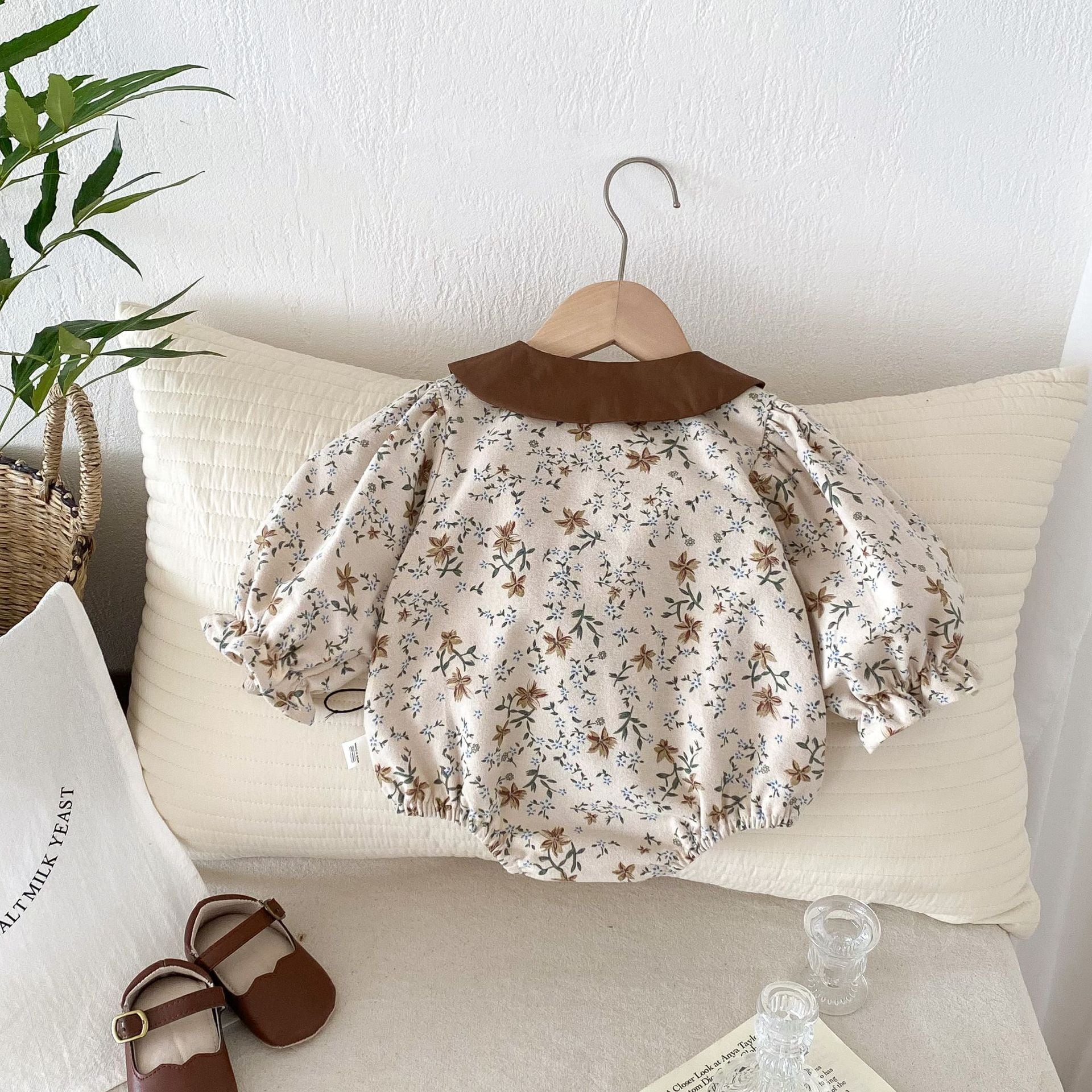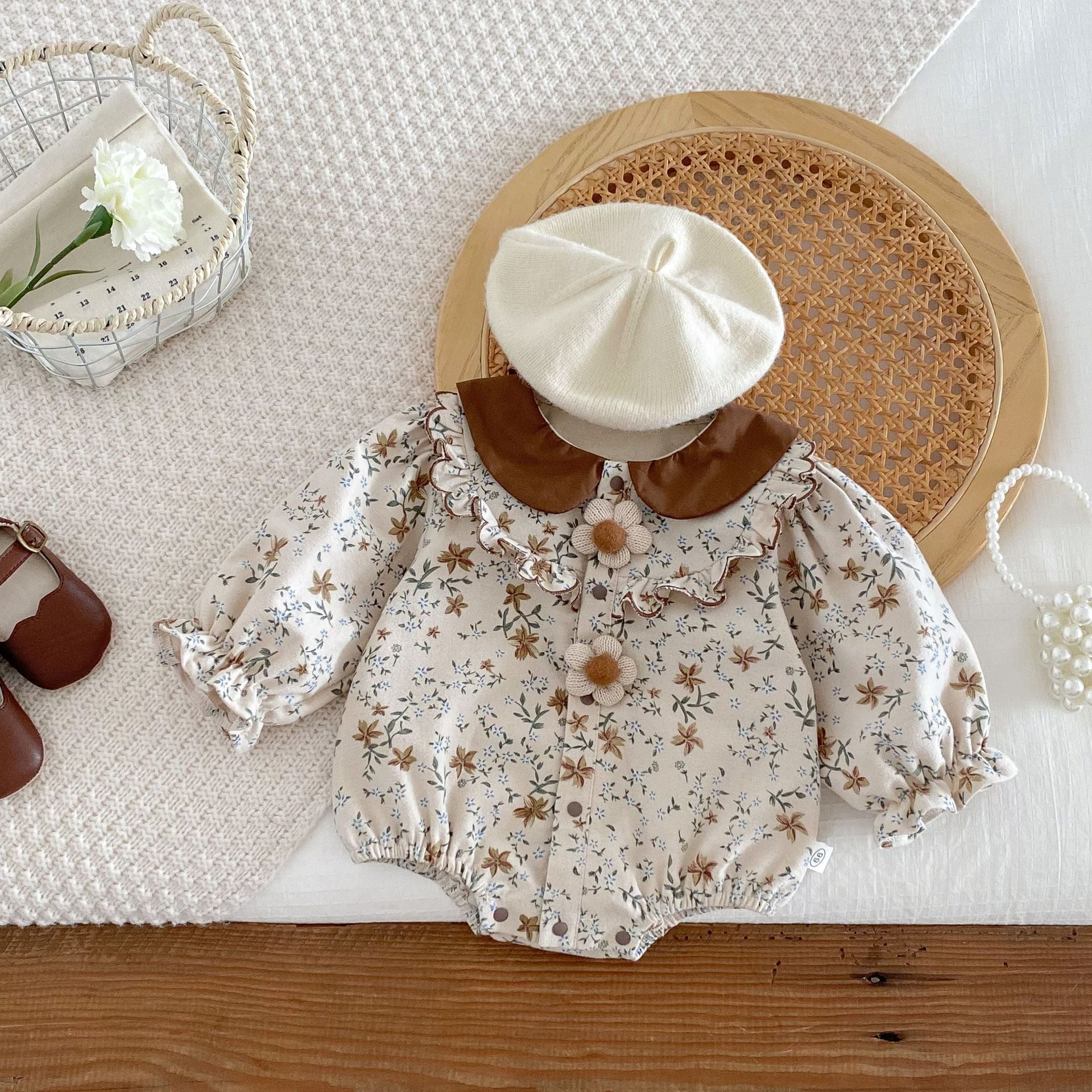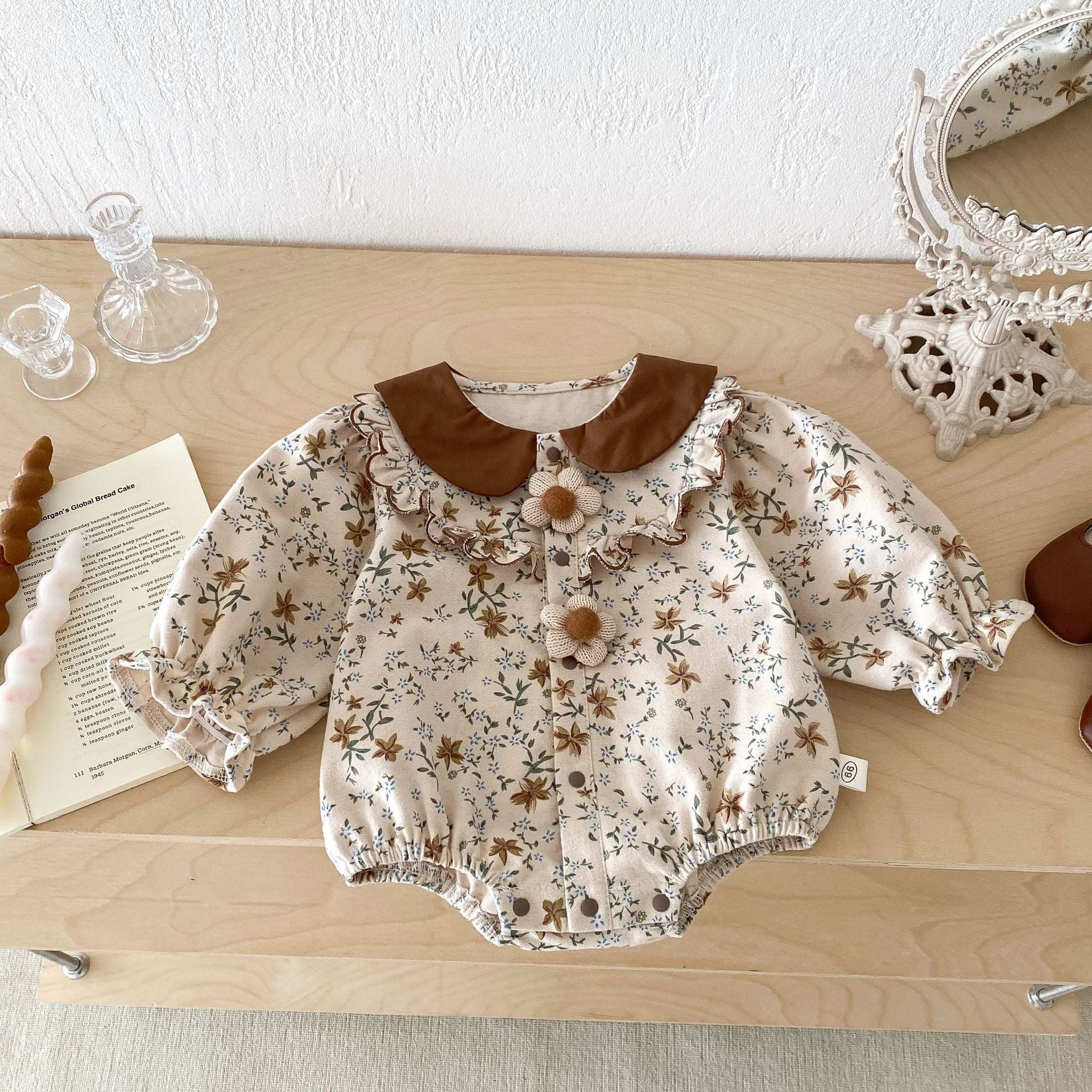 【66-90cm】ロンパース ブラウン花 可愛い 肌に優しい ベビー服