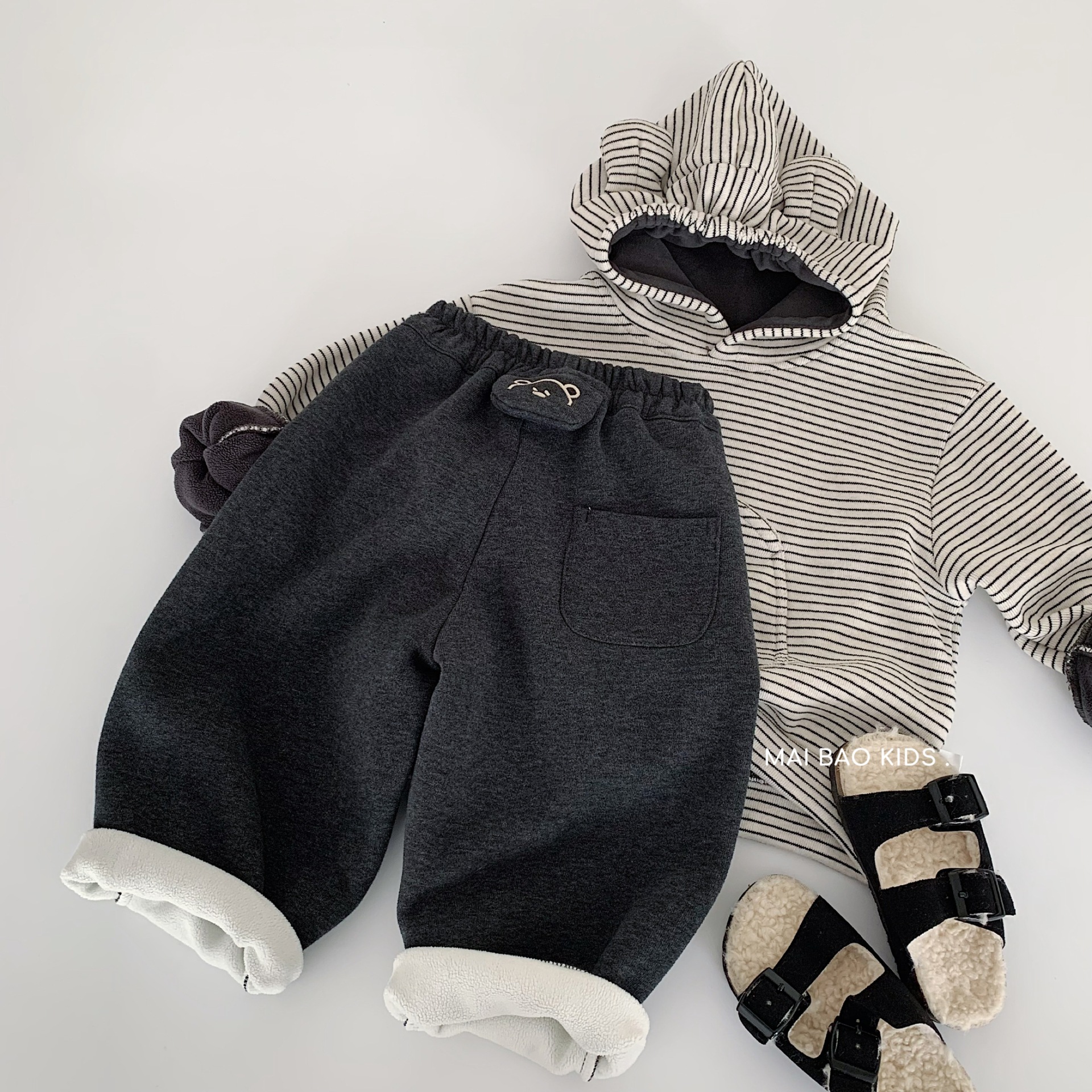 【80-140cm】ボーダー柄 フード付き 裏起毛 パーカー/パンツ
